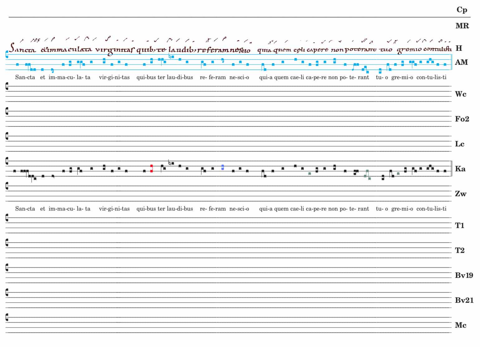 Im folgenden Verlauf wird die Melodie durch die Clivis aufgrund der Akzente „im-ma-cu-lá-tá“ angereichert. Die Übersteigerung zum „sol“ bei „virginitas“ dient nur zur Betonung der „Jungfräulichkeit“, die Melodie könnte eigentlich auf dem „fa“ bleiben.