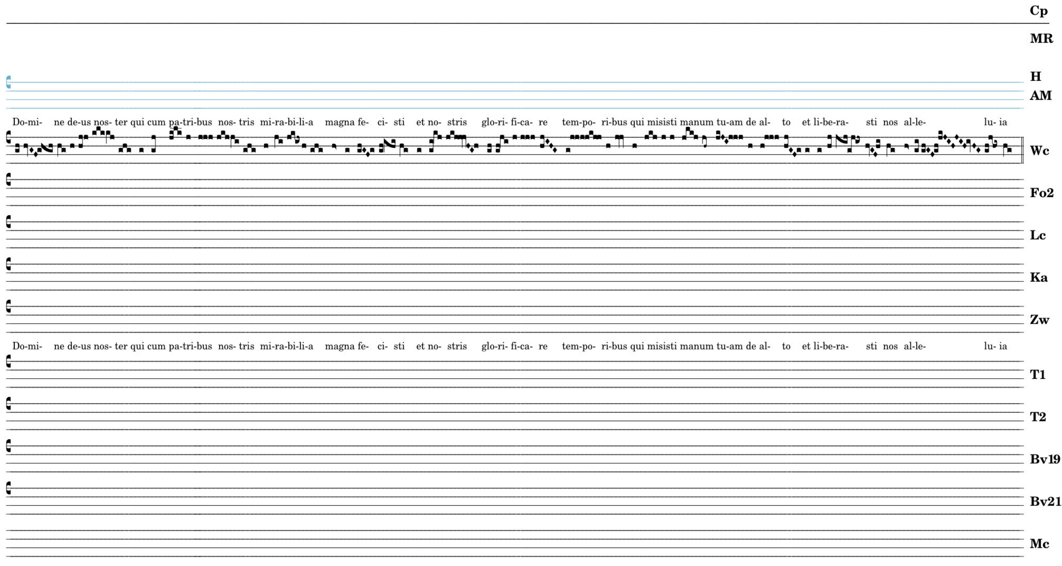Domine deus noster / qui cum patribus nostris / mirabilia magna fecisti / et nostris glorificare temporibus / qui misisti manum tuam de alto / et liberasti nos alleluia.