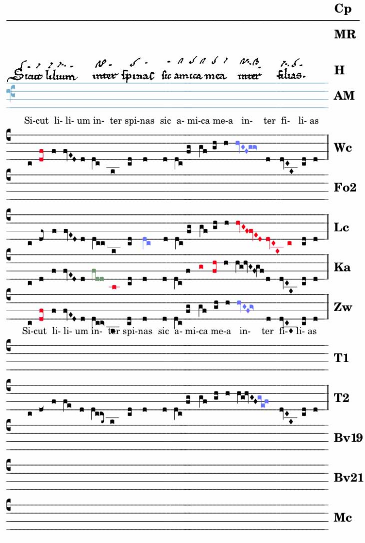 🟢 Eine nicht mehr ganz authentische Komposition. Nicht nur ist die Neumenschrift a.m., auch die eigenartige Behandlung der 1INC Clv, mit FML PeCl überformt und ohne unmittelbar folgende Sinnspitze („sic amica mea in-ter filias“, kein „sa“ ?) weist darauf hin. Allerdings ist die Antiphon bereits im 11.Jahrhundert belegt (T2).