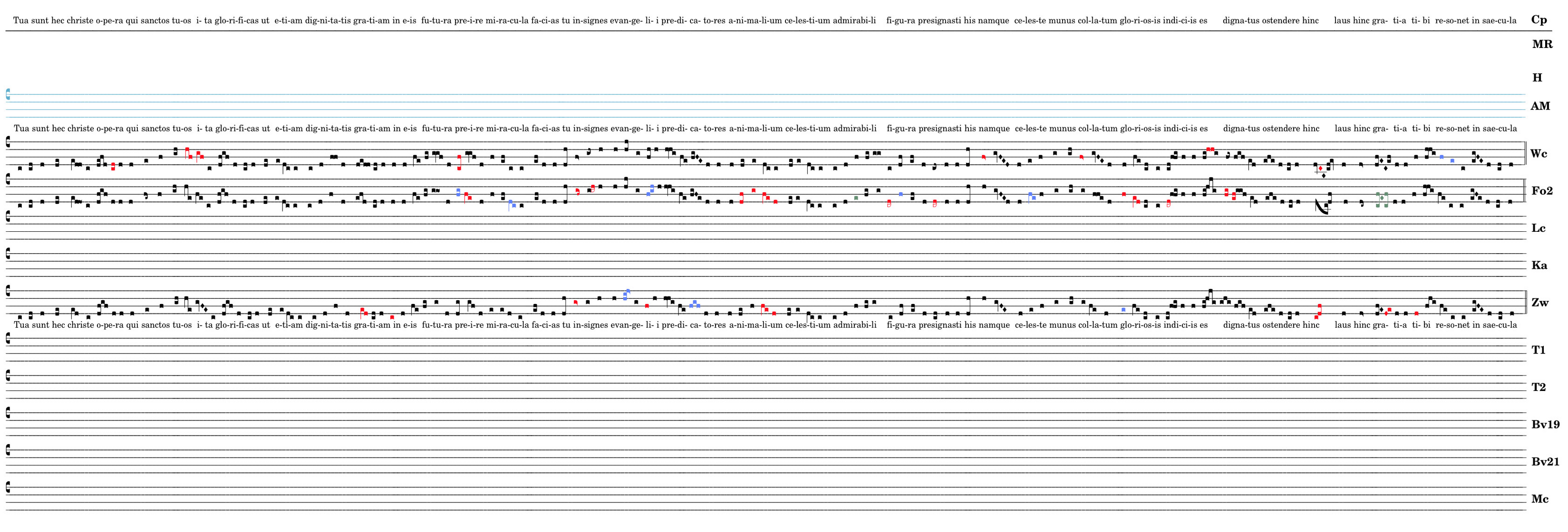 Tua sunt haec christe opera / qui sanctos tuos ita glorificas / ut etiam dignitatis gratiae / in eis futura praeire miracula facias / tu insignes evangelii predicatores / animalium celestium / admirabili figura presignasti / his namque celeste munus collatum gloriosis / indiciis es dignatus ostendere / hinc laus hinc gloria / tibi resonet in saecula.