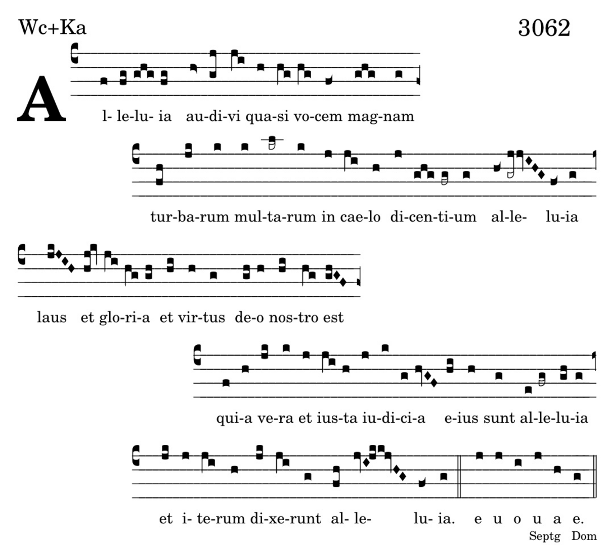 Alleluia / audivi quasi vocem magnam / turbarum multarum in caelo dicentium / alleluia laus et gloria et virtus deo nostro est / quia vera et iusta iudicia eius sunt / alleluia / et iterum dixerunt / alleluia.