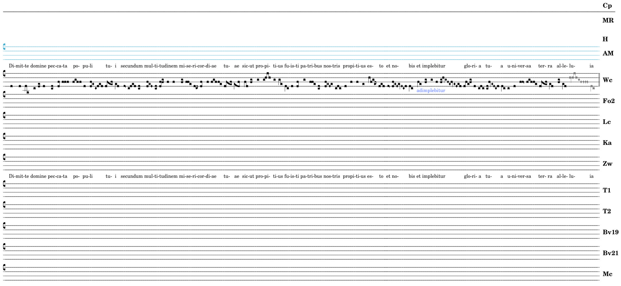 Dimitte domine / peccata populi tui / secundum multitudinem misericordiae tuae / sicut propitius fuisti patribus nostris / propitius esto et nobis / adimplebitur gloria tua u/ niversa terra / alleluia.