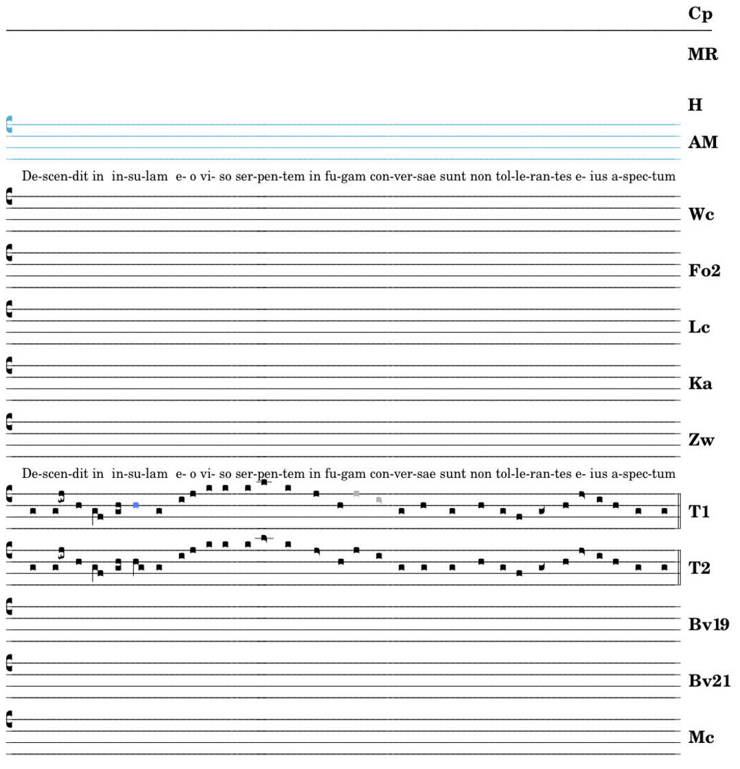 Descendit in insulam / eo viso serpentes / in fugam conversae sunt / non toleran ↔ tes eius aspectum.