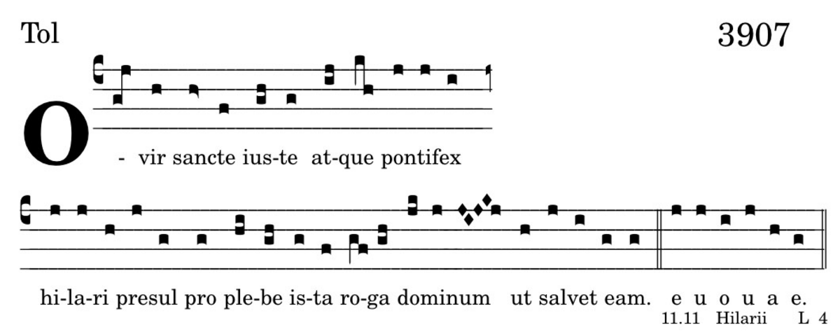 O vir sancte iuste / atque pontifex / hilari praesul / pro plebe ista / roga dominum / ut salvet eam.