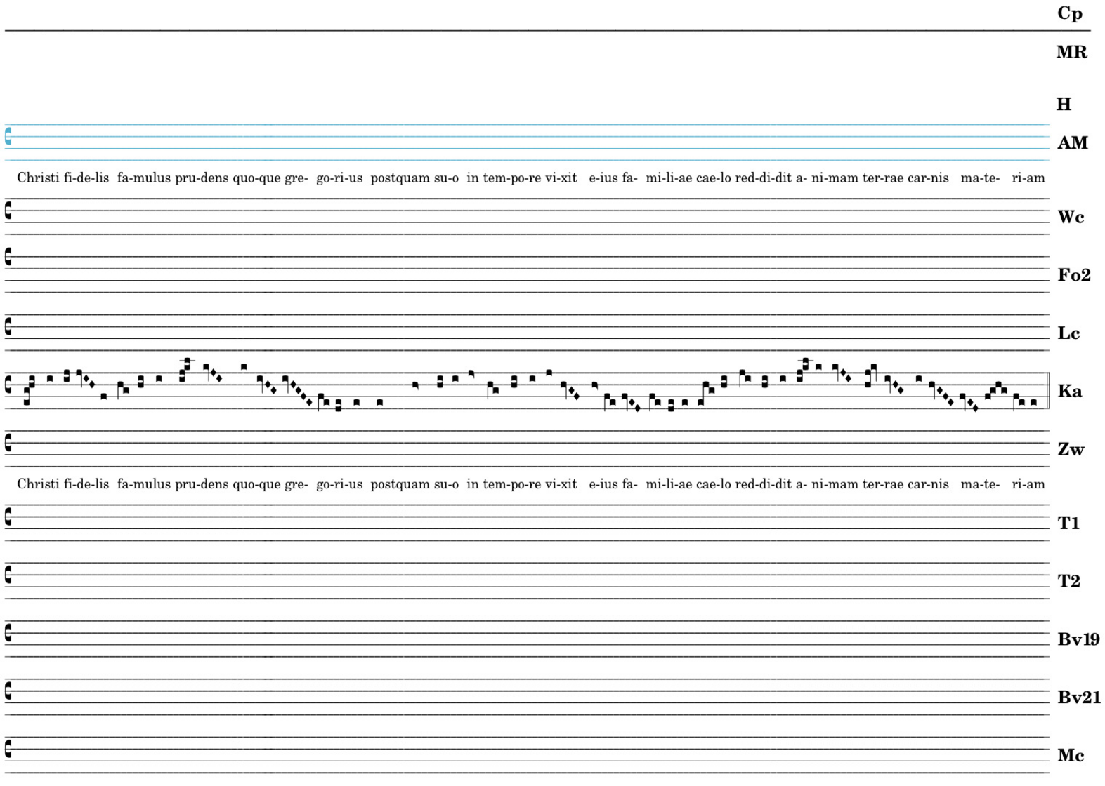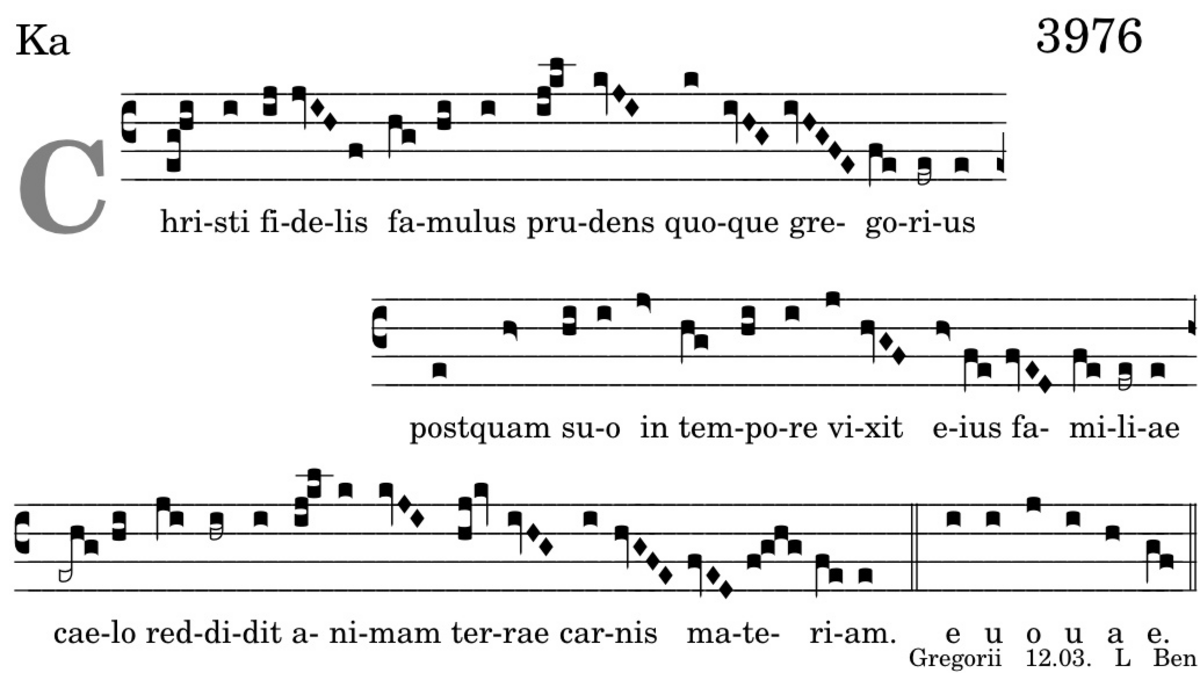 Christi fidelis famulus / prudens quoque gregorius / ./.../.. ./.../.. postquam suo in tempore / vixit eius familiae / ./.../.. ./.../.. caelo reddidit animam / terrae carnis materiam. ./.../.. ./.../..