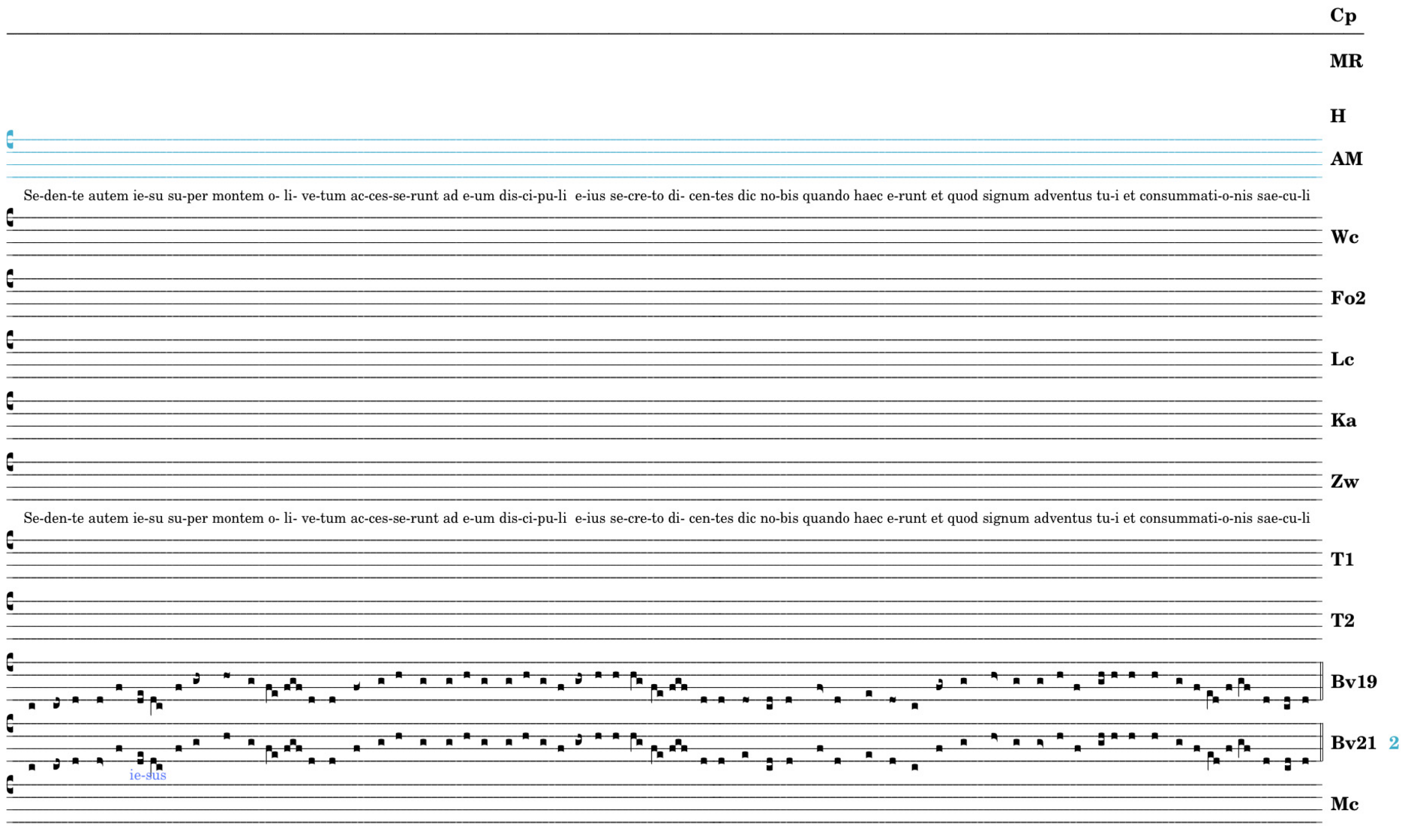 Sedente autem iesu / super montem olivetum / accesserunt ad eum discipuli eius / secreto dicentes / dic nobis quando haec erunt / et quod signum adventus tui / et consummationis saeculi.