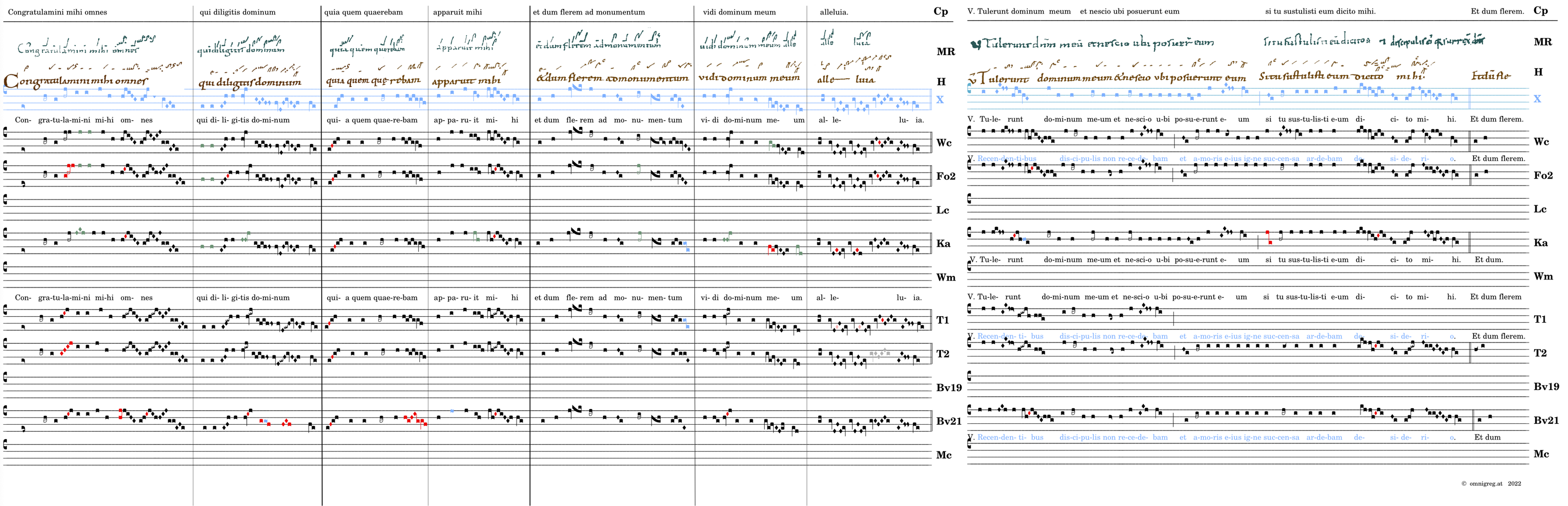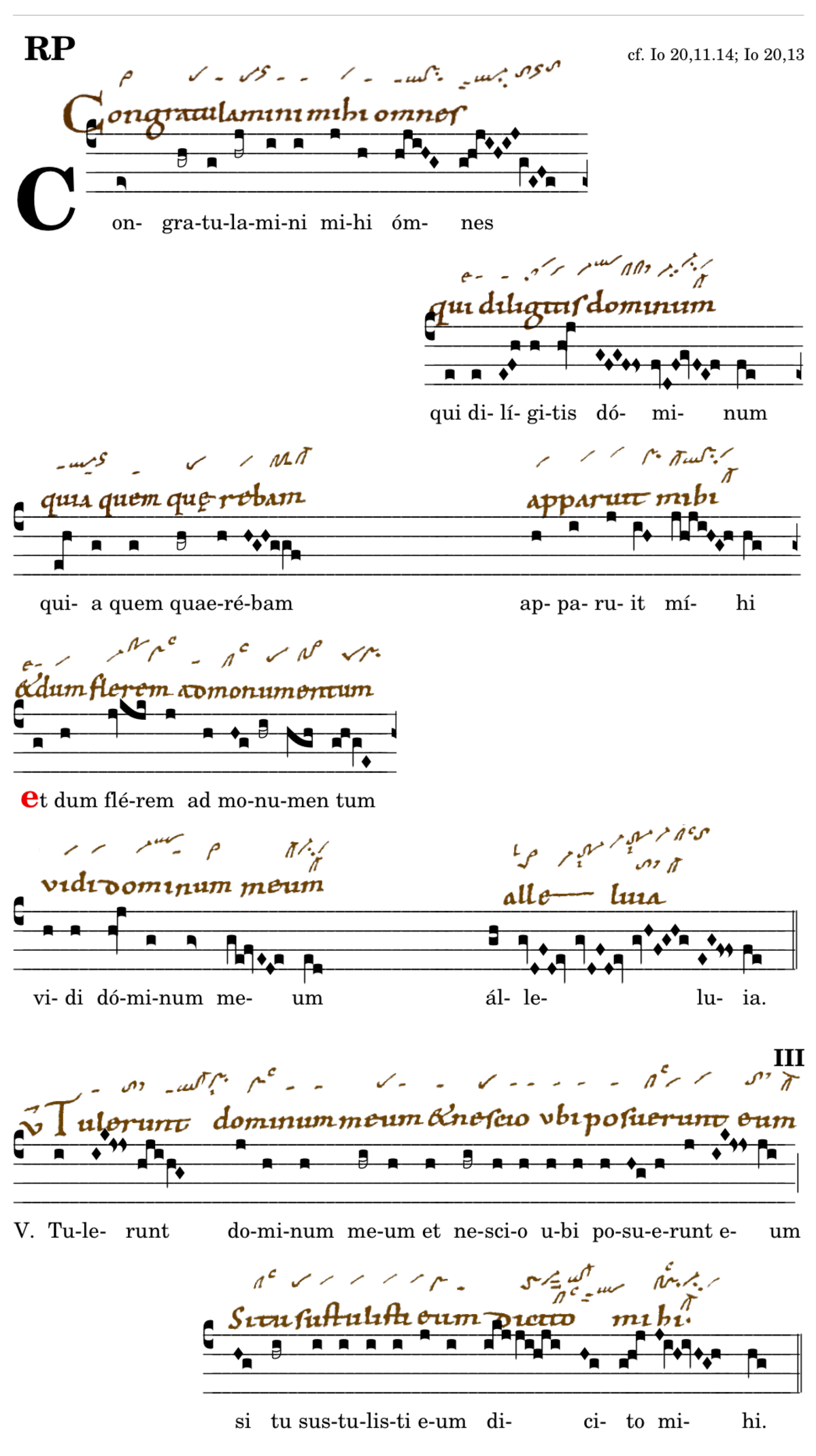 Congratulamini mihi omnes / qui diligitis dominum / quia quem quaerebam / apparuit mihi / 📍Et dum flerem ad monumentum / vidi dominum meum / alleluia . V. Tulerunt dominum meum* et nescio ubi posuerunt eum . si tu sustulisti eum dicito mihi. (omnes) V. Recendentibus discipulis non recedebam / et amoris eius igne succensa ardebam desiderio.