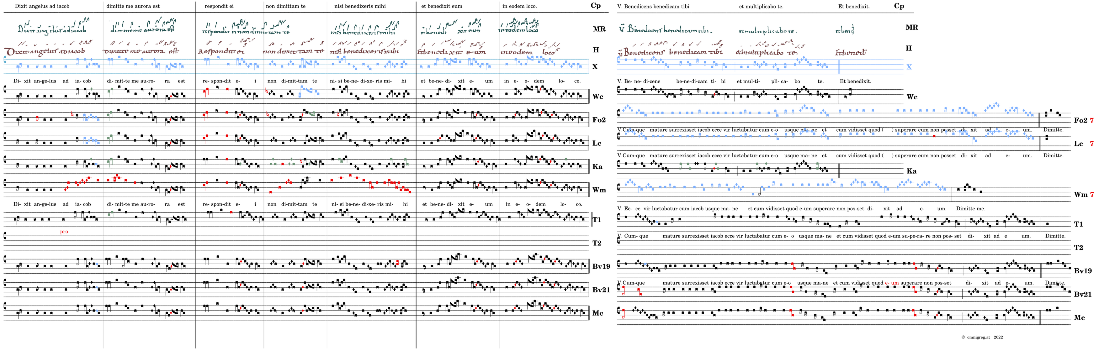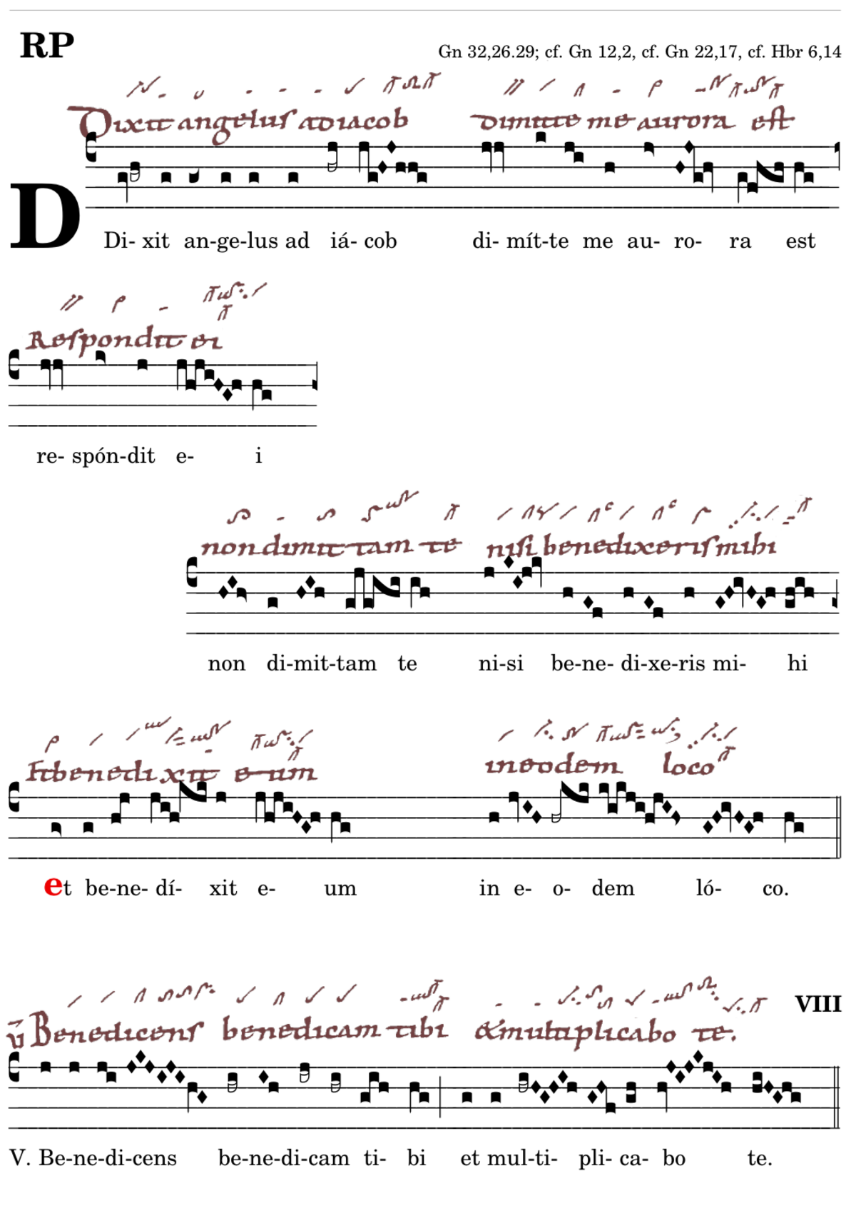 Dixit angelus ad iacob 📍dimitte me aurora est / respondit ei / non dimittam te / nisi benedixeris mihi / 📍Et benedixit eum / in eodem loco. V. Benedicens benedicam tibi* et multiplicabo te. (Fo2,Lc,T1) V. Cumque mature surrexisset iacob ecce vir luctabatur cum eo usque mane / et cum videret quod eum superare non posset dixit ad eum. (Wm) V. Ecce vir luctabatur cum iacob usque mane / et cum vidisset quod eum superare non posset dixit ad eum. (MR) V. Et dixit ..... .