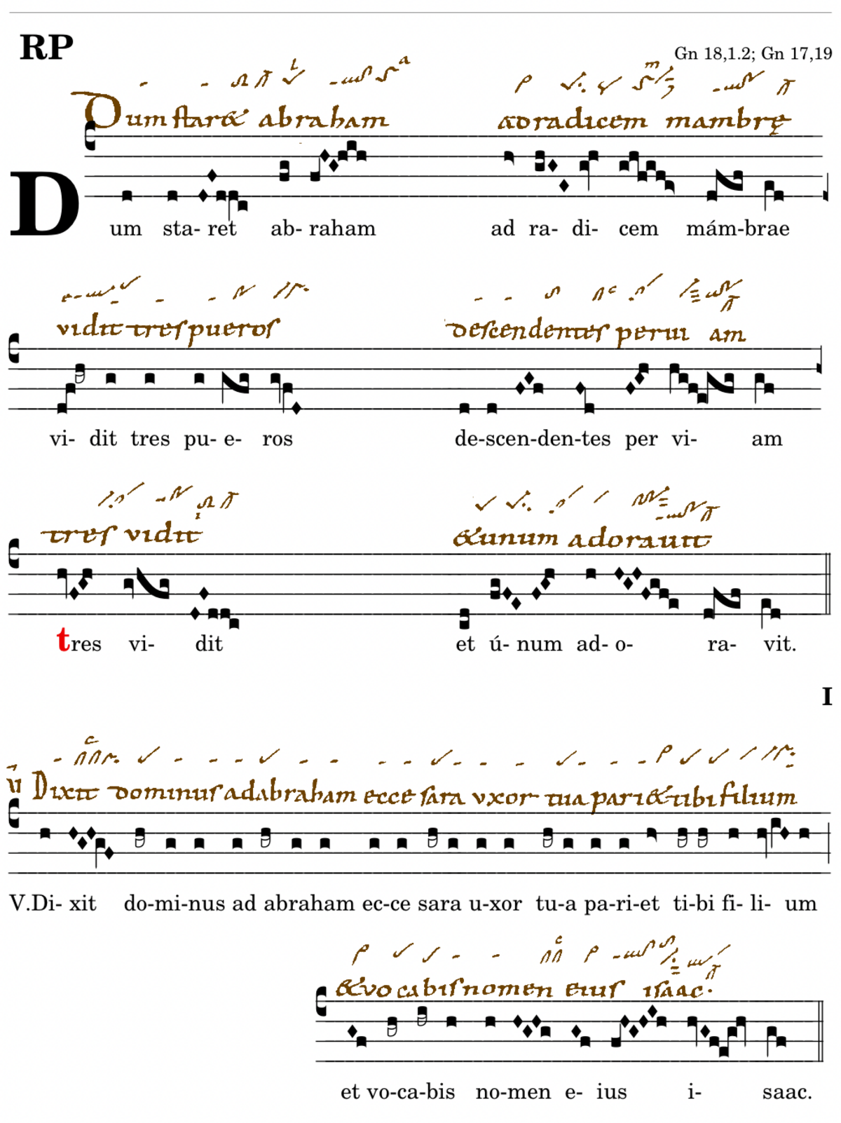 Dum staret abraham / ad radicem (- ilicem) mambrae / vidit tres pueros (- viros) / descendentes per viam / 📍tres vidit / et unum adoravit. V. Dixit(que) dominus ad abraham . ecce sara uxor tua pariet tibi filium* et vocabis nomen eius isaac. (Wc) V. Cumque stetisset abraham in ostio tabernaculi sui in ipso fervore diei vidit tres pueros descendentes. (Bv,Mc) V. Cumque sedisset abraham in foribus domus suae vidit tres viros venientes ad se.