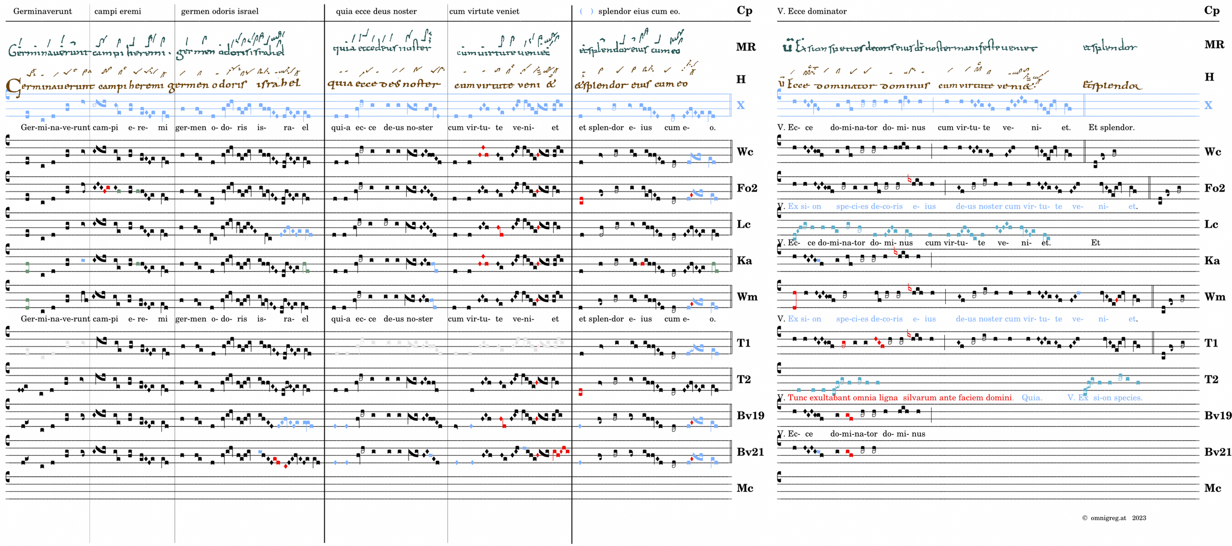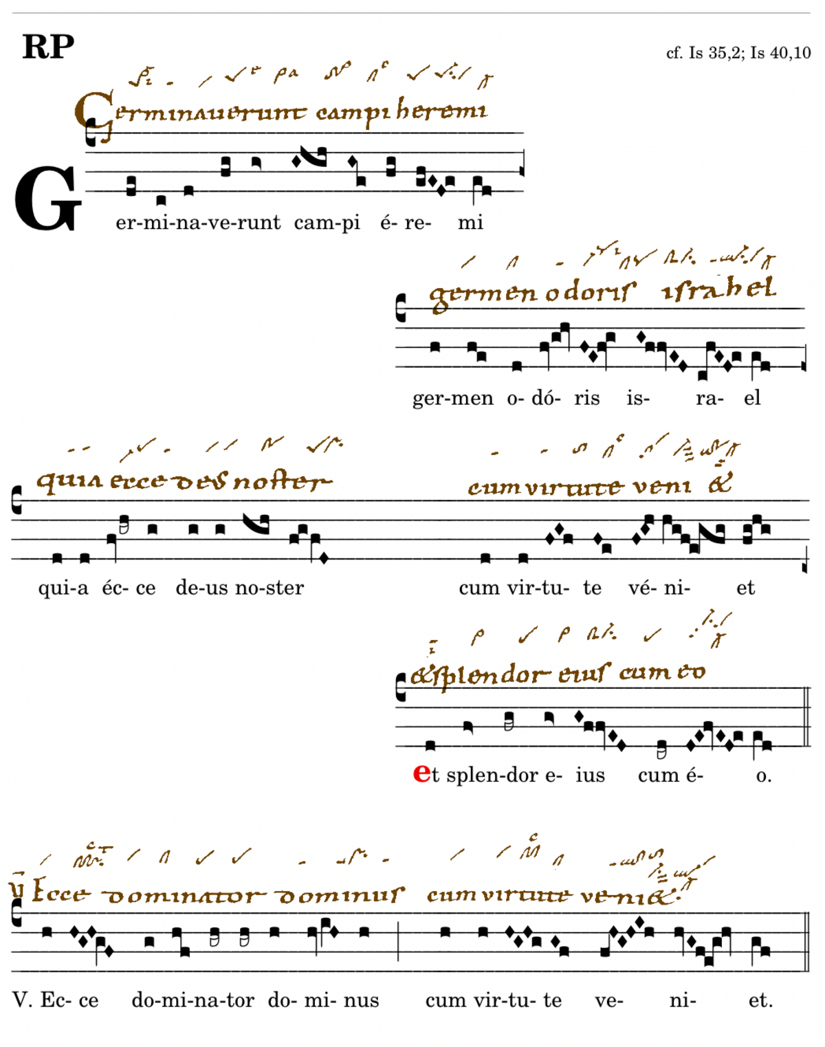Germinaverunt campi . eremi / germen odoris israel / 📍quia ecce deus noster / cum virtute veniet / 📍Et splendor eius cum eo. V. Ecce dominator dominus* cum virtute veniet. (MR,Fo2,Zw,Wm,Tol) V. Ex sion species decoris eius deus noster manifeste veniet. (T2) + V. Tunc exultabant omnia silvarum ante faciem domini.
