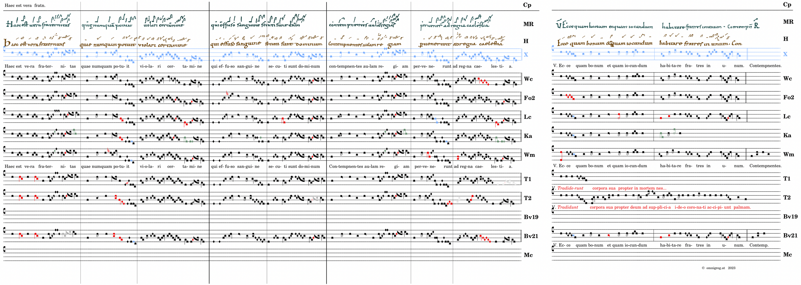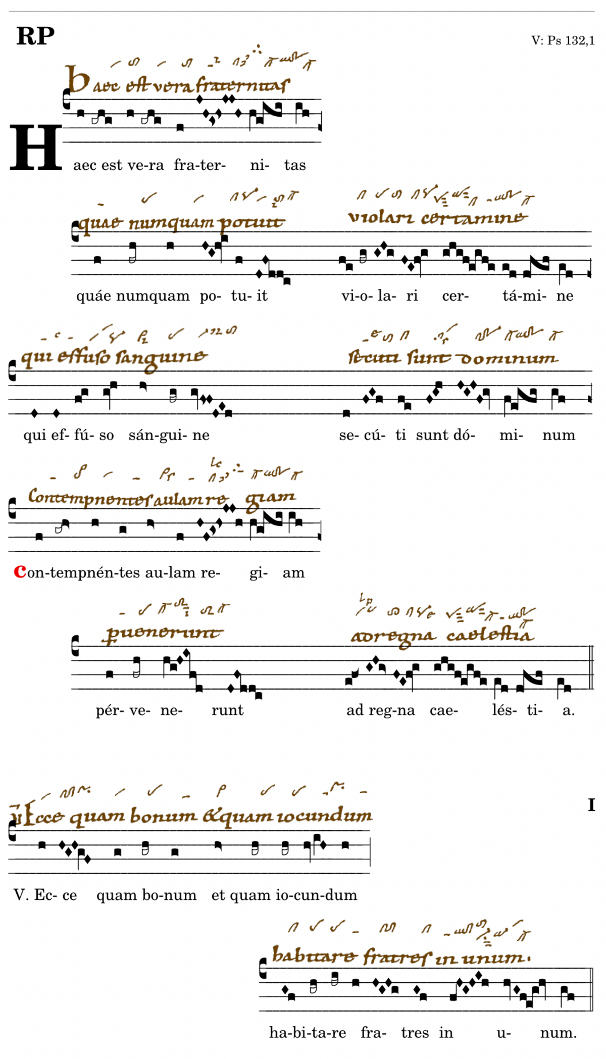 Haec est vera fraternitas / quae numquam potuit / violari certamine / qui effuso sanguine / secuti sunt dominum / 📍Contempnentes aulam regiam (- aulas regias) / pervenerunt / ad regna caelestia. V. Ecce quam bonum et quam iucundum* habitare fratres in unum. (T2) V. Tradidunt corpora sua propter deum ad supplicia ideo coronati accipiunt palmam. (T1) V. Tradiderunt corpori sua in ...
