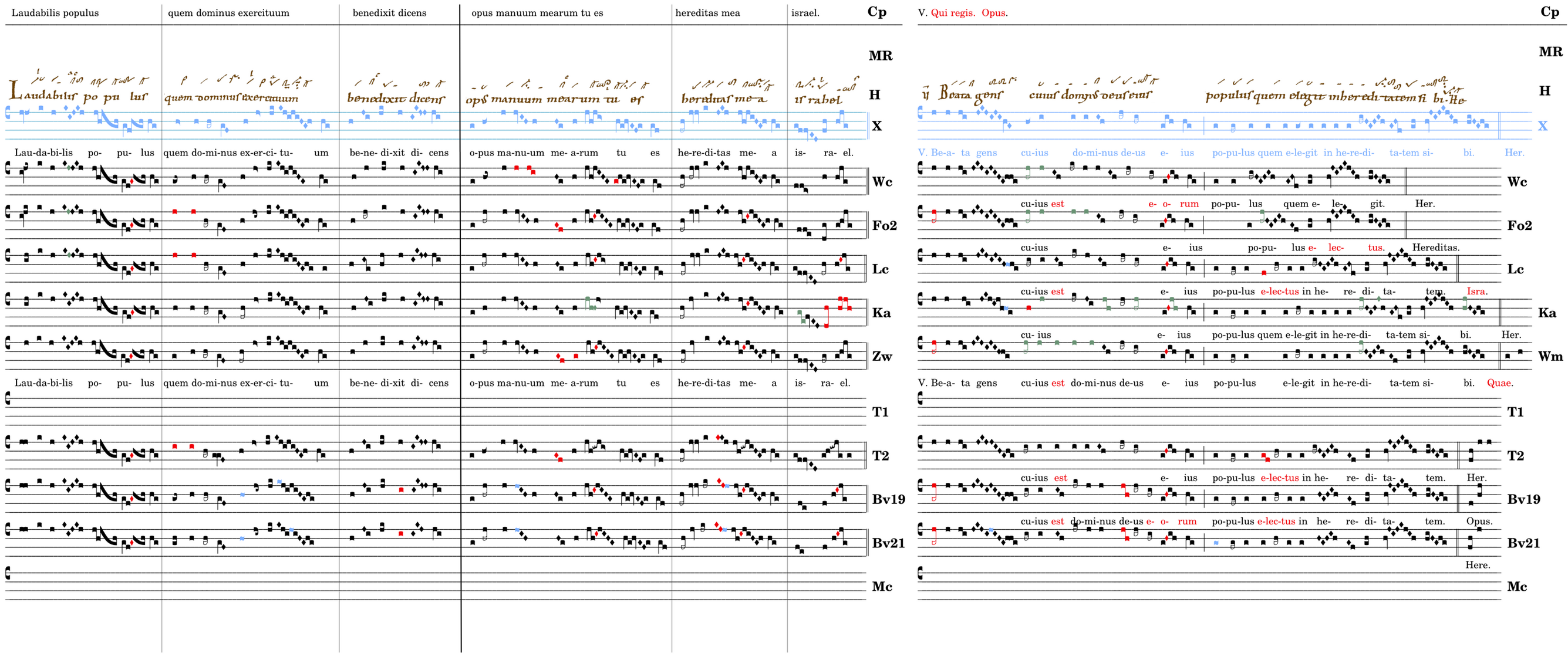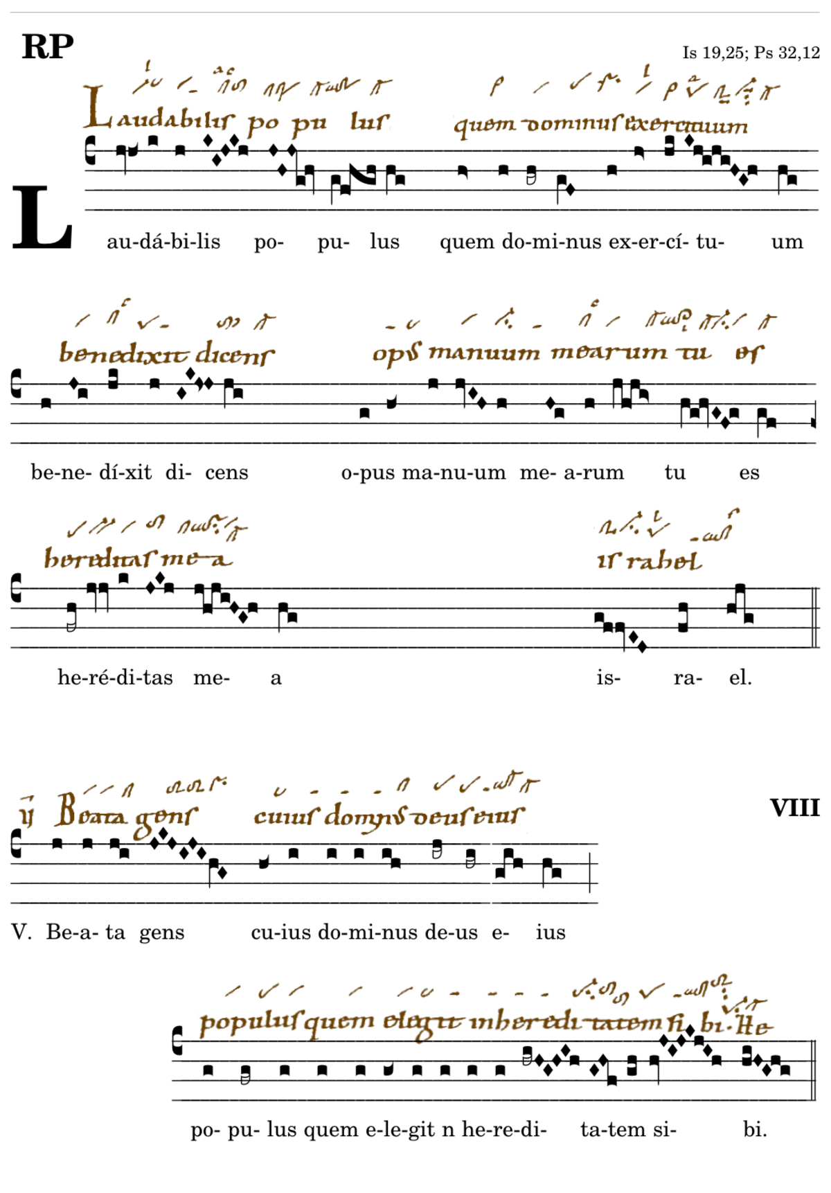 Laudabilis populus / quem dominus exercituum / benedixit dicens 📍 opus manuum mearum tu es / 📍hereditas mea 📍israel. V. Beata gens cuius (est) dominus deus eius* populus quem elegit in hereditatem (sibi). (Fo2,Lc,T2,Bv) V. Beata gens cuius est dominus deus eius (-Bv: eorum) / populus electus (in hereditatem). (Cp) V. Qui regis.