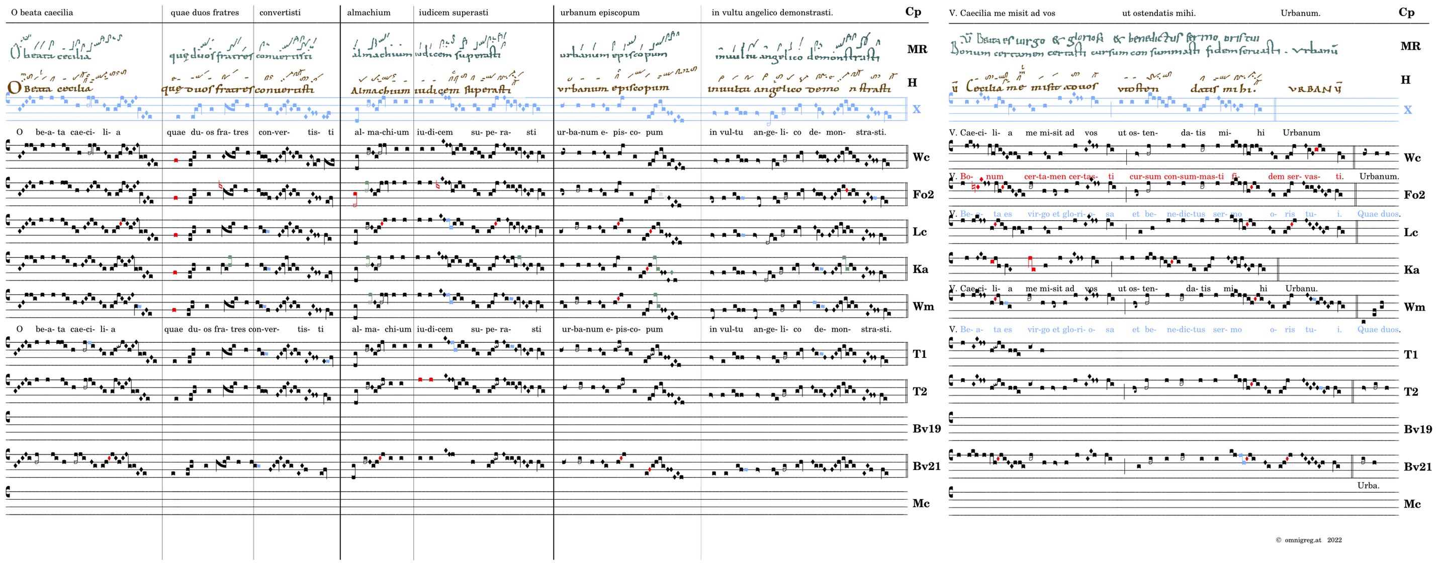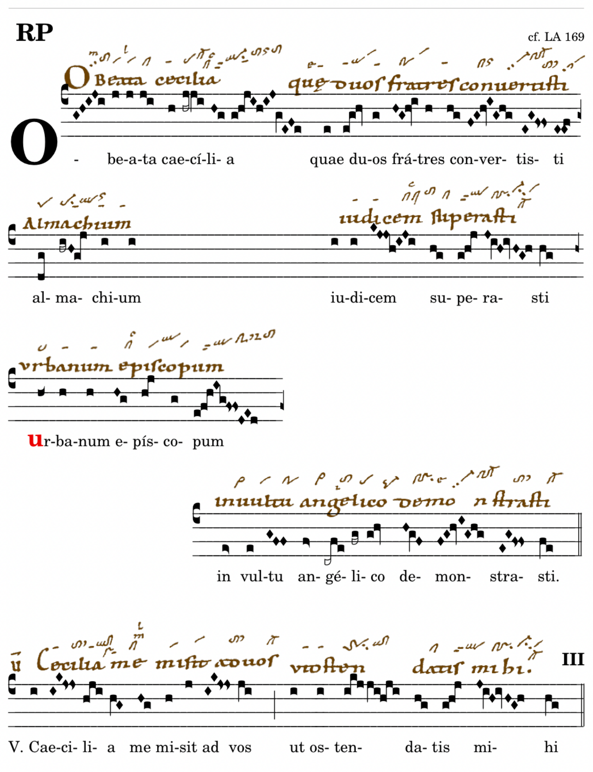 O beata caecilia 📍quae duos fratres / convertisti / 📍 almachium / iudicem superasti / 📍 urbanum episcopum / in vultu angelico . demonstrasti. V. Caecilia me misit ad vos* ut ostendatis mihi. (MR,Lc,Fo2,Wm,Tol,Bv) V. Beata es virgo (et) gloriosa et benedictus sermo oris tui. (MR,Wc) V. Bonum certamen certasti cursum consmummasti fidem servasti.