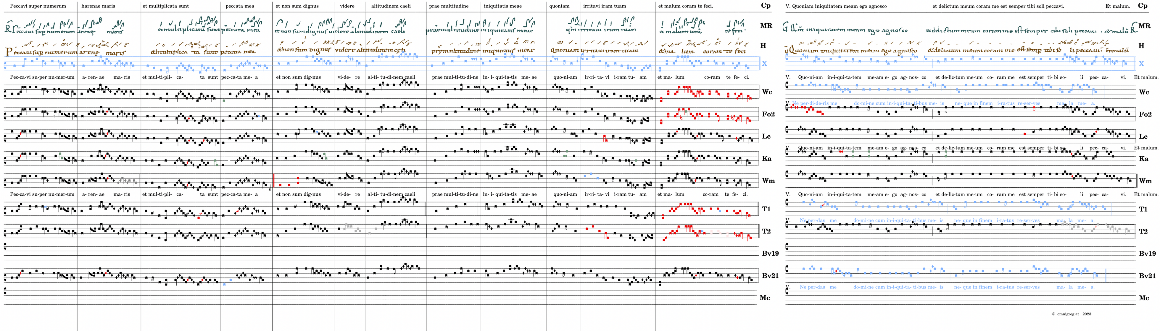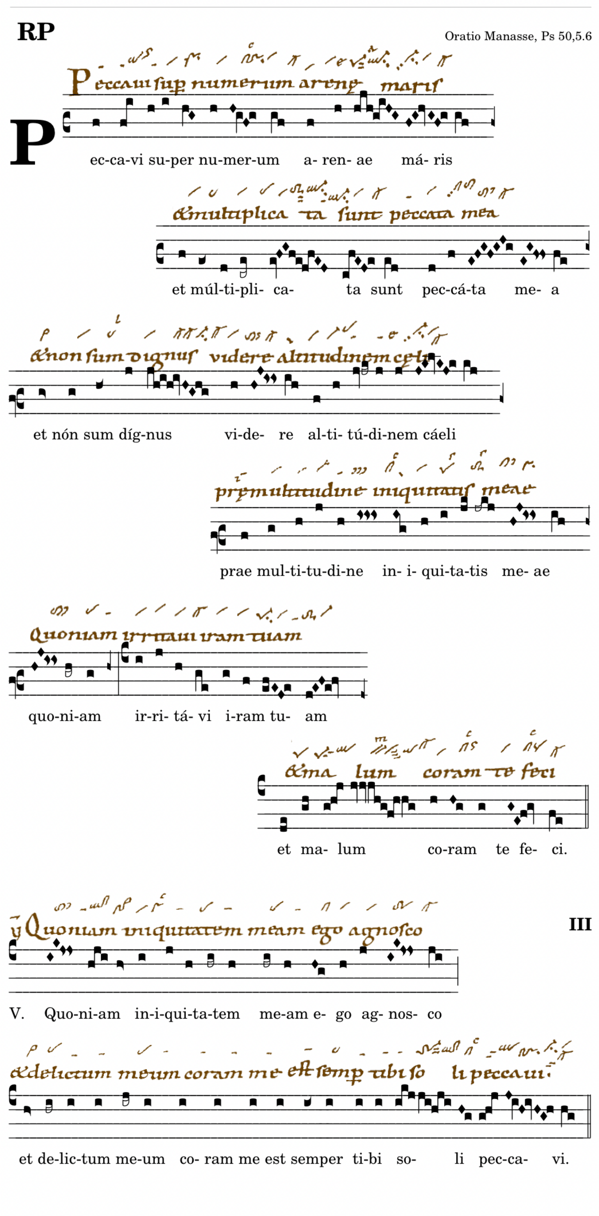 Peccavi super numerum / arenae maris / et multiplicata sunt / peccata mea / et non sum dignus / videre / altitudinem / caeli / prae multitudine / iniquitatis meae / quoniam / irritavi iram tuam 📍 et malum coram te feci. V. Quoniam iniquitatem meam ego agnosco* et delictum meum coram me est semper tibi soli peccavi. (Wc,T1) V. Ne perdas me domine cum iniquitatibus meis neque in finem ... reserves mala mea.