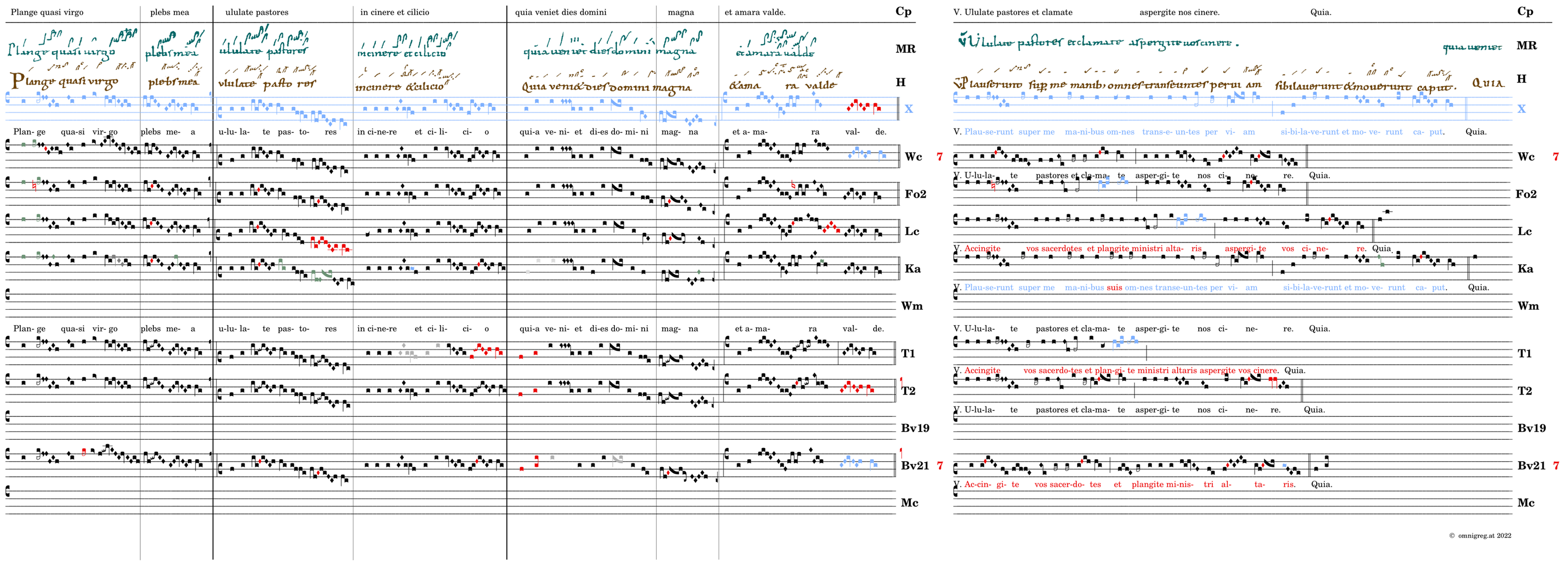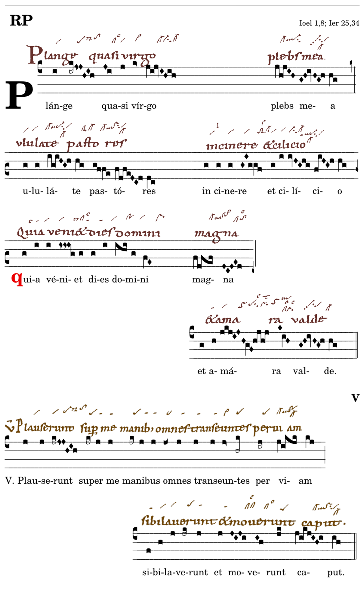 Plange quasi virgo / plebs mea / ululate pastores / in cinere et cilicio / 📍Quia veniet dies donimi magna / at amara valde. V. Plauserunt super me manibus omnes transeuntes per viam* sibilaverunt et moverunt caput. (MR,Wc,T2,Fo2) V. Ululate pastores et clamate aspergite vos cinere. (T1,Lc,Bv2) V. Accingite vos sacerdotes et plangite ministri altaris (aspergite vos cinere).