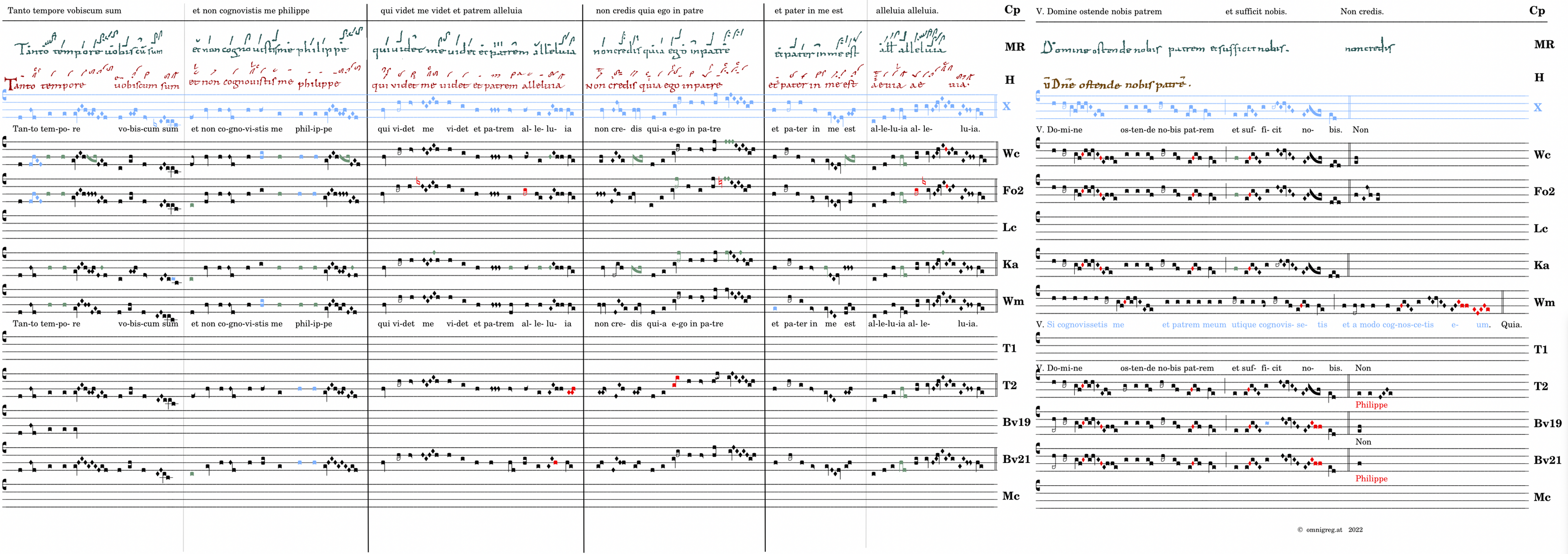 Tanto tempore / vobiscum sum / et non cognovistis me 📍philippe / qui videt me / videt et patrem alleluia / 📍Non credis 📍quia ego . in patre / et pater in me est / alleluia alleluia. (CO 0740) V. Domine ostende nobis patrem* et sufficit nobis. (Wm) V. Si cognovissetis me et patrem meum utique cognovissetis et a modo cognoscetis eum.
