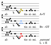 „altissimi“ L, Ch (und MR ?) setzten den ersten Ton des vorletzten nkTrc gleich hoch seinem vorvorherigen Ton „do-sa-do“. Das „fa“ als Gipfelton des Trc wie in Bv ist durch 'sursum' in L und E bestätigt.