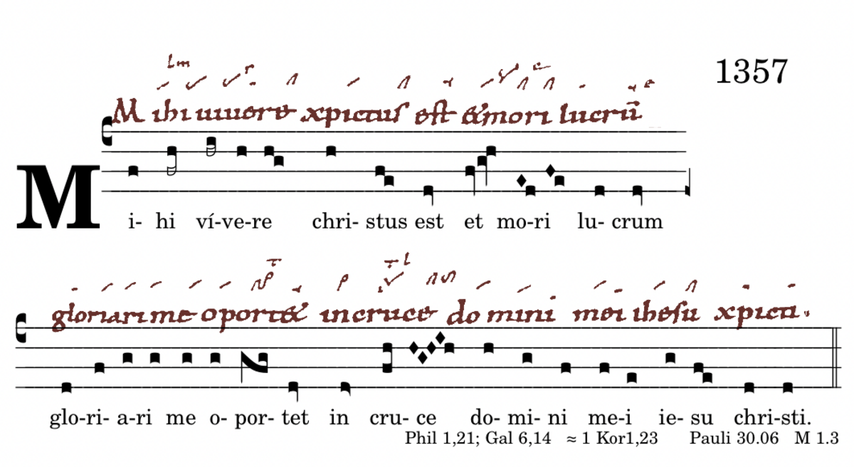 The 2nd period is composed along 1TYPOS 1INC ad4 recites like 1MED typ aud „sol“, the por „o-por-tet“ accelerates over the accent and jumps to „re“. This prepares the Clv intonation of the FML quia is prepared, the second tone of the Clv is prevented by liquescence. „in cru-ce“ The usual pes of the last syllable „sol-la“ is replaced by FML circulatio, a valorisation that the Lord's cross certainly deserves: circulatio. 1TER clv begins with the falling line „la-sol-fa“, which belongs to both 1NOV type and 1TER. The cento 1TER clv expands the text, „domini mei iesu christe“ must by no means be neglected.