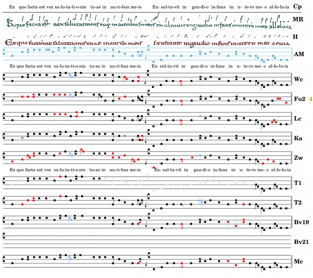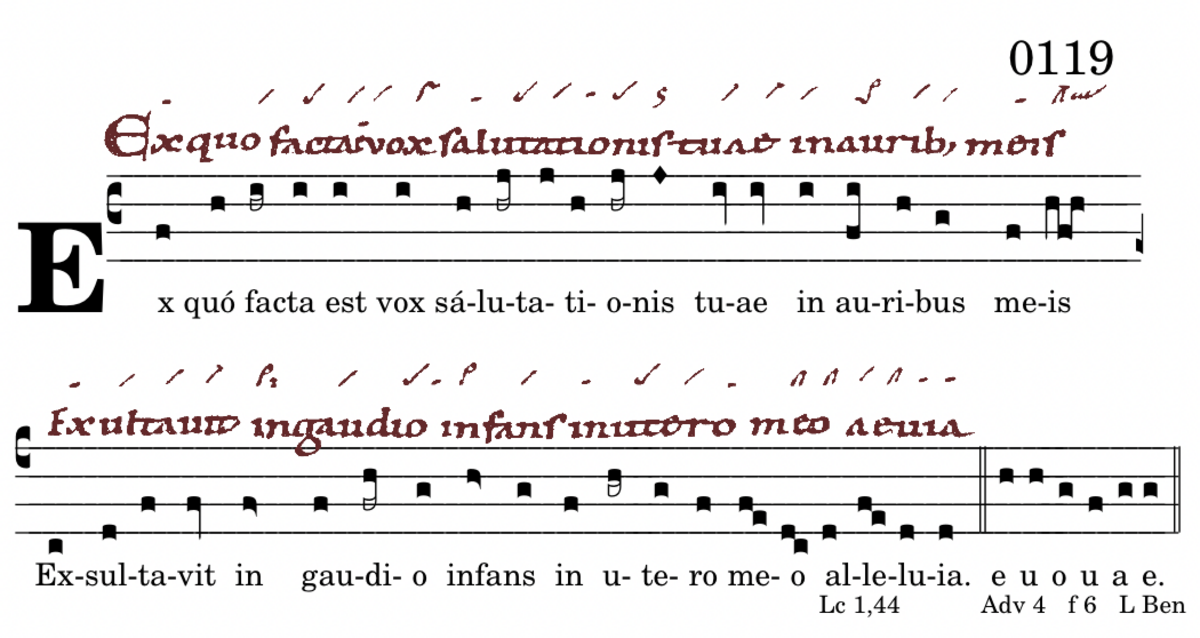 Ex quo facta est / vox salutationis tuae / in auribus meis / exsultavit / in gaudio infans in utero / meo alleluia.