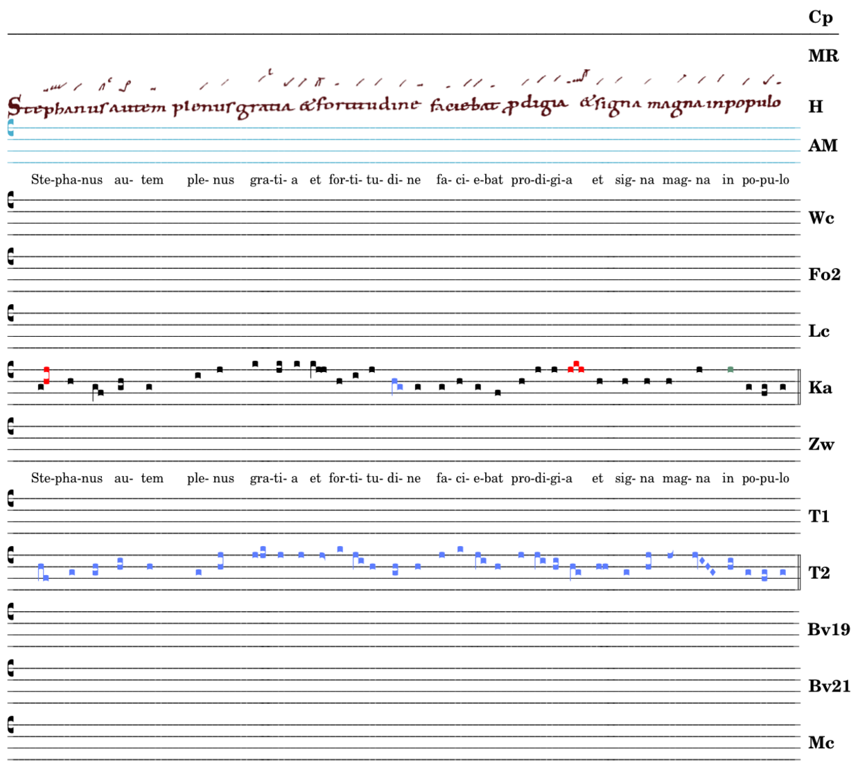 Aufgrund schlechter Quellenlage (inklusive fehlender Parallelstellen des Centos in anderen Antiphonen) ist der Torculus auf „prodigi-a“ nicht eindeutig rekonstruierbar. Aus der Schreibgewohnheit von Ka, si zum do zu heben („Choraldialekt des 2. Jahrtausends“), lässt sich die Version des Ergebnisses rechtfertigen; vgl. weiters die Unterschiede der west- und ostfränkischen Tradition (0576).