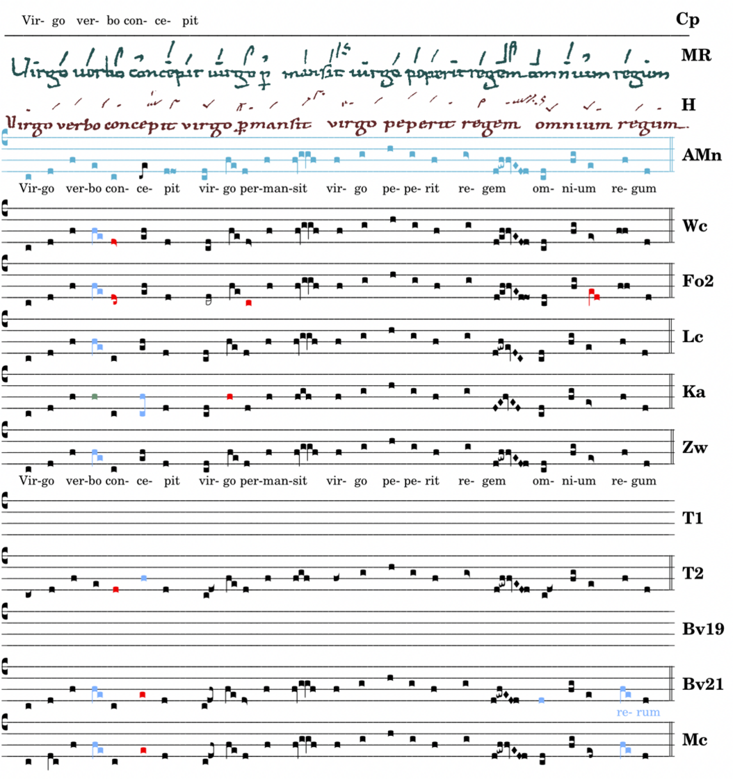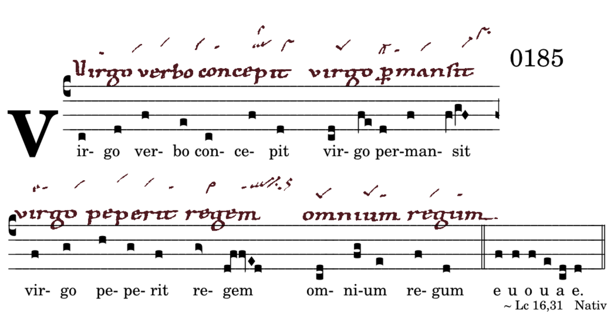 Virgo verbo concépit / virgo permánsit / virgo péperit régem / omni . um régum.