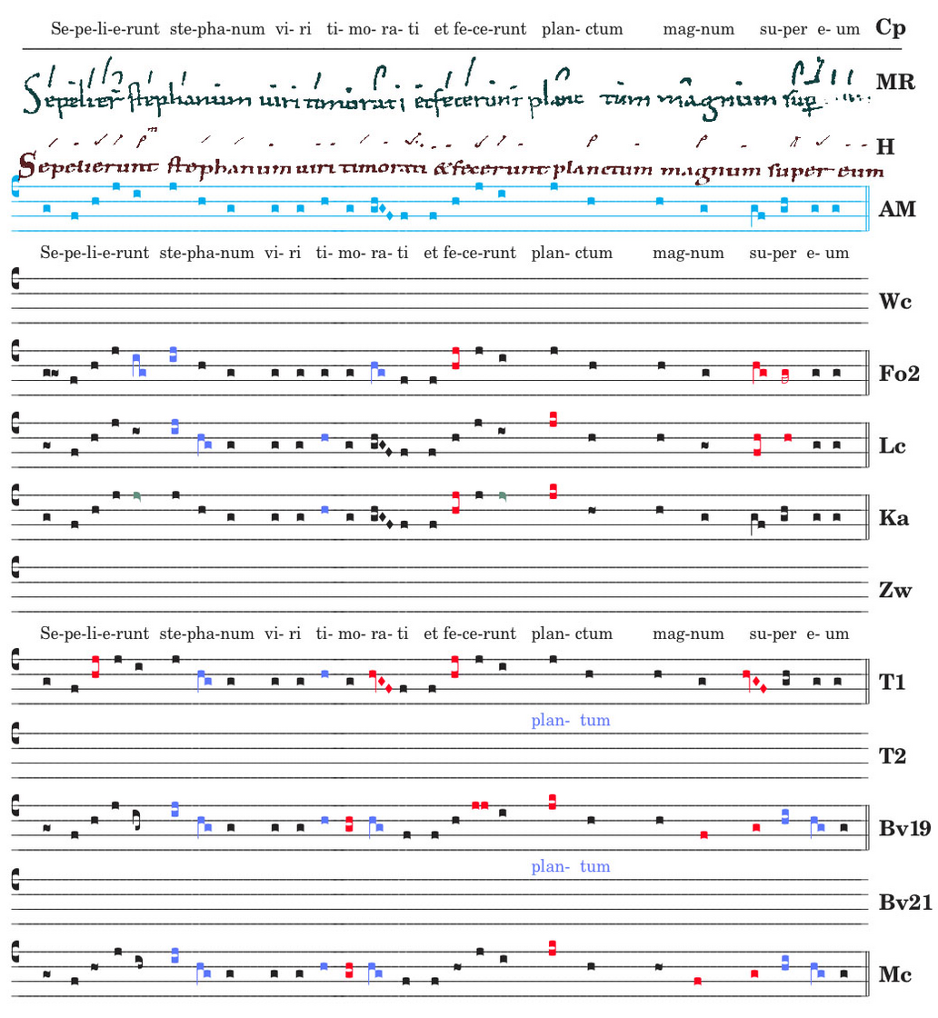 Sepelierunt stephanum / viri timorati / et fecerunt / planctum magnum super eum.