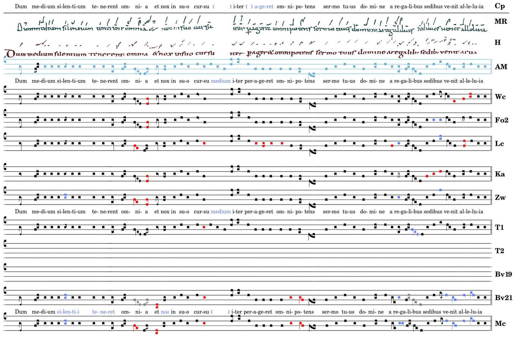 Dum medium silentium / tenerent omnia / et nox in suo cursu / iter perageret / omnipotens / sermo tuus domine / a regalibus / sedibus ↔ venit alleluia.