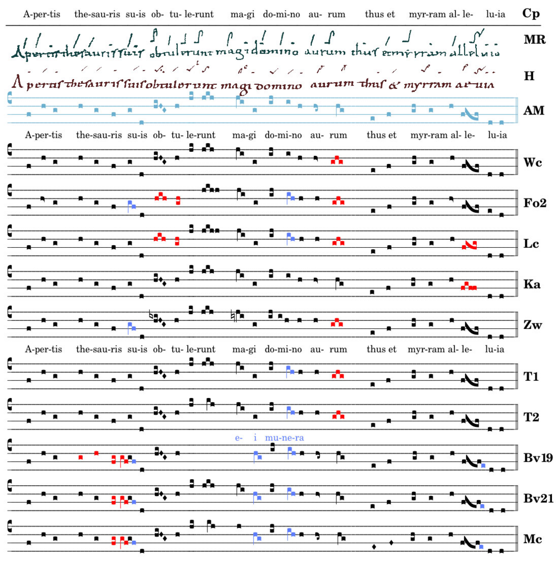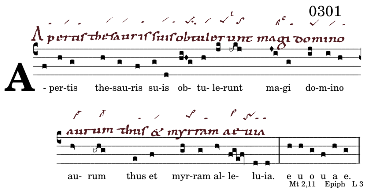 Apertis thesauris suis / obtulerunt magi domino / aurum thus et myrram / alleluia.