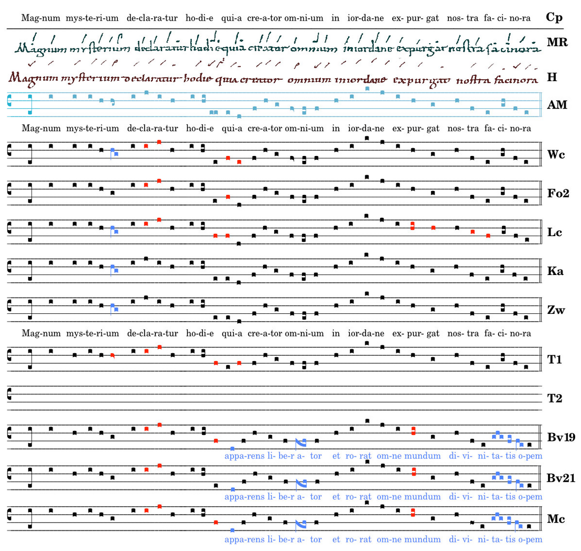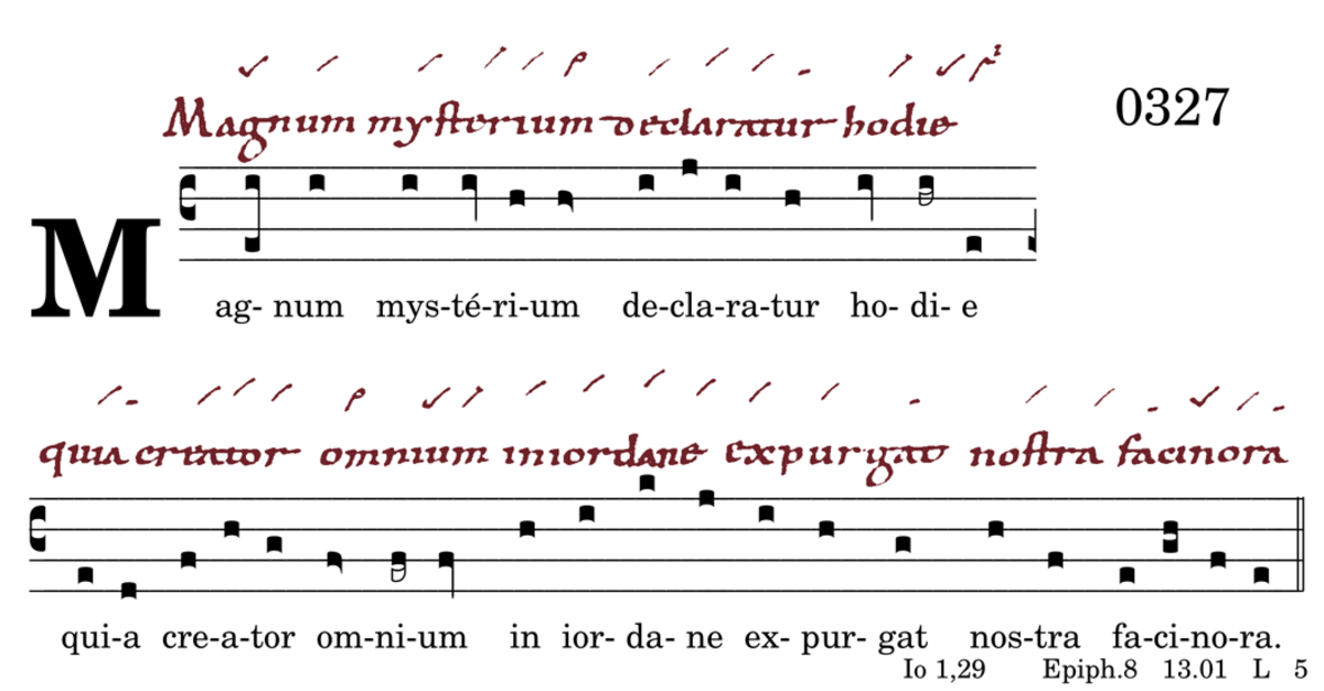 Magnum mysterium / declaratur hodie / quia creator omnium / in iordane expurgat / nostra facinora.