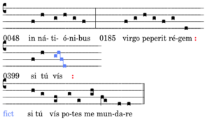 1MED triv Eine geniale Lösung. Die steile Fügung „si tú vís“ ist durch die zweiakzentige Form (M-Form) des Cento vertont. Dazu kommt der Absprung zum re: Doppelpunkt. Dieser nur dreisilbige Text wird trotz seiner Kürze der Melodie 1BIN triv unterlegt, die letzten Töne durch Synärese auf eine Silbe gebracht. Es entsteht ein nkPes subpunctis, die Neume, die theologisches Schwergewicht ausdrückt: „wenn Du willst…“.