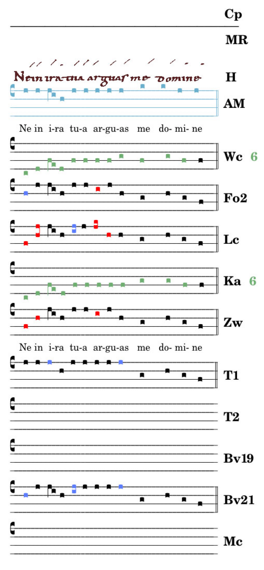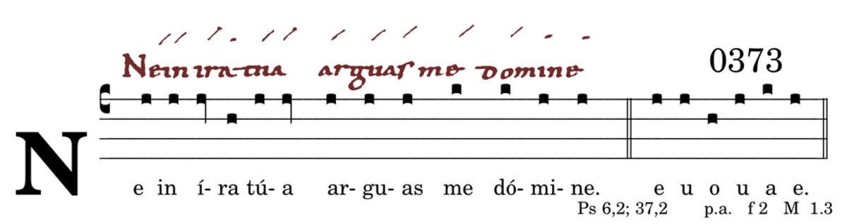 Semiologischer Exkurs: Das Episem gibt einer Silbe mehr Wert. Das ist nicht immer die Akzentsilbe, es kann auch die Endsilbe sein. „Ne in í-ra tú-a“. Das Episem auf der Endsilbe bestätigt im Nachhinein den Akzent dieses Wortes, andererseits gliedert es und setzt vom folgenden ab. Vgl. auch 0401, 0448, 0488, 0941.