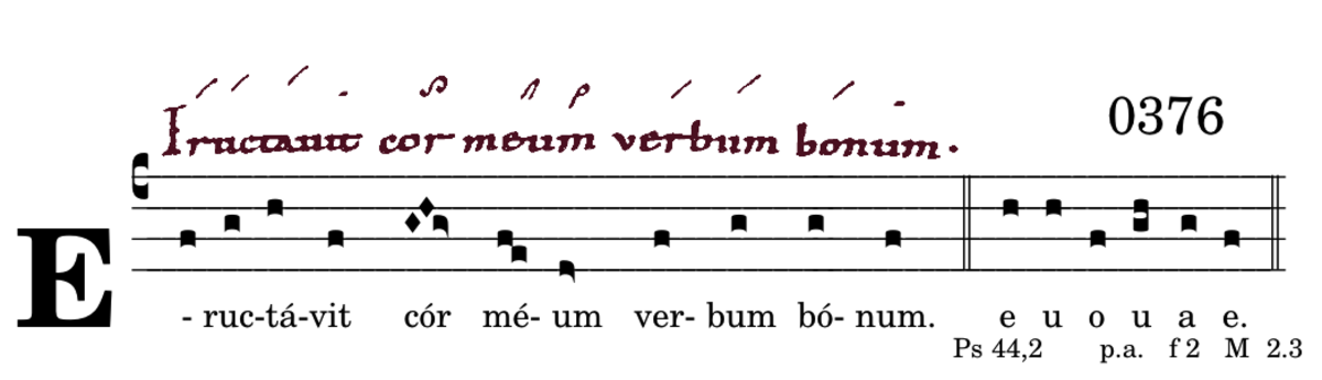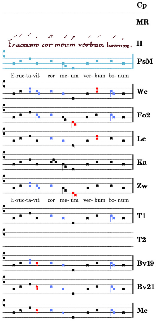 Die steile Fügung „cór mé-um“ verlangt, dass mit der Normalmelodie etwas geschieht: der Akzenttorculus sichert den ersten Akzent, der zweite liegt auf der Binnensilbenclivis. Darüber hinaus steht dem Oxytonon „cor“ ein Torculus zu. Dieser sprachlichen Sorgfalt befleißigen sich aber nur H und sein Enkel Ka, alle anderen gehen schematisch vor.