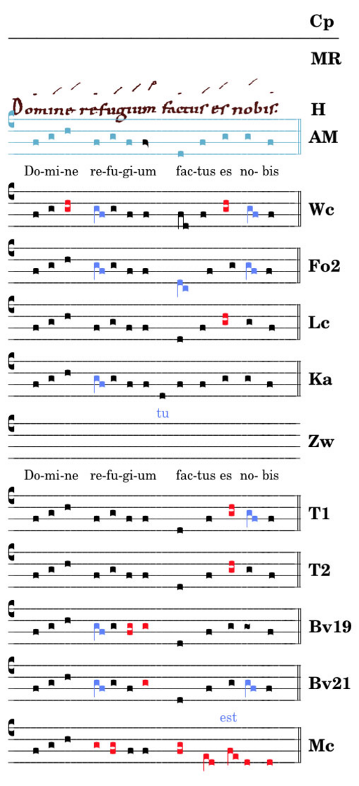 Offensichtlich verstehen die diastematischen Handschriften diesen bildhaften Umgang mit der Melodie nicht. Sie versuchen alle, die Vorgabe von H mit der Norm in Einklang zu bringen. Dass die Vorgabe wirklich „sol-sol-sol“ ist, beweist das leichte Ansteigen der Virgae in H.