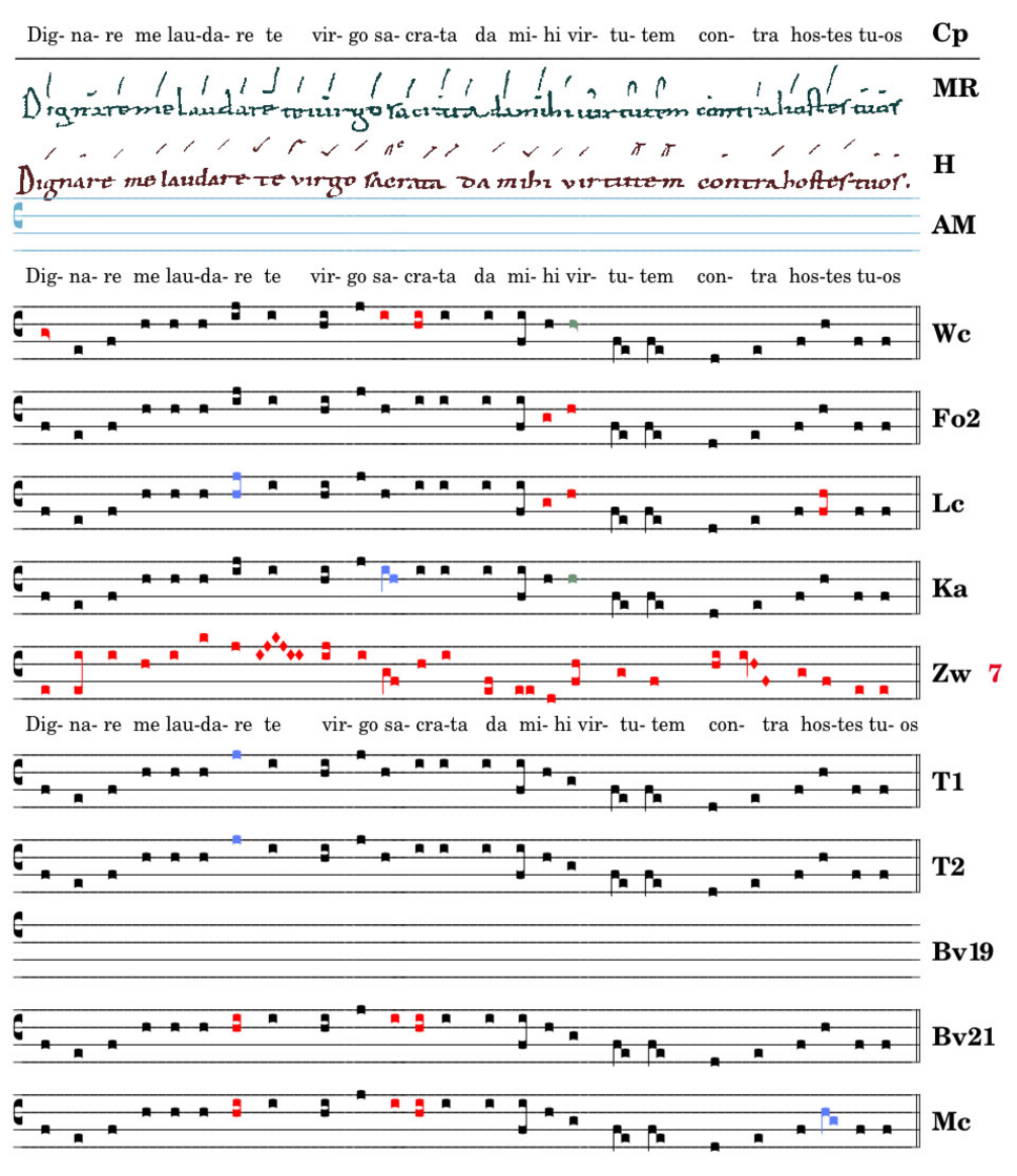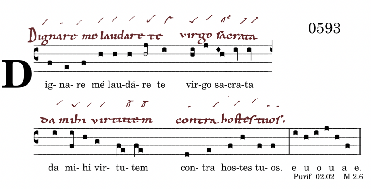 Dignare me laudare te / virgo sacrata / da mihi virtutem / contra hostes tuos.