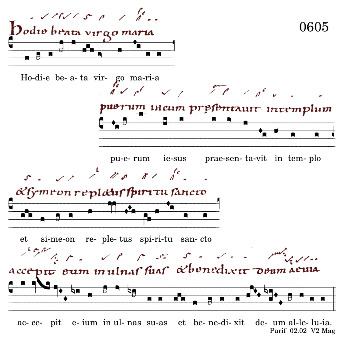 Hodie / beata virgo maria / puerum iesum praesentavit in templum / et simeon repletus spiritu sancto / accepit eius in ulnas suas / et benedixit deum alleluia.