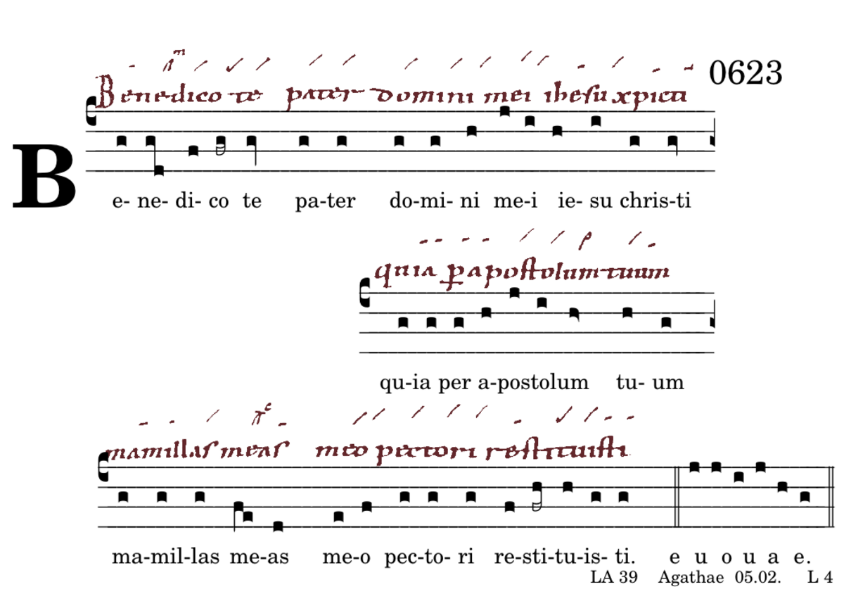 Benedico te pater / domini mei iesu christi / quia per apostulum tuum / mamillam meam meo pectori restituisti.