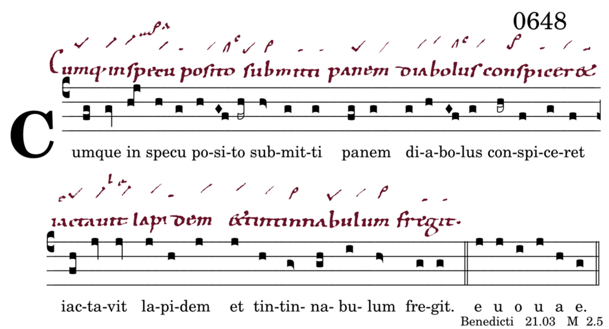 Cumque inspecu posito submitti / panem diabolus conspiceret / iactavit lapidem / et tintinnabulum fregit.