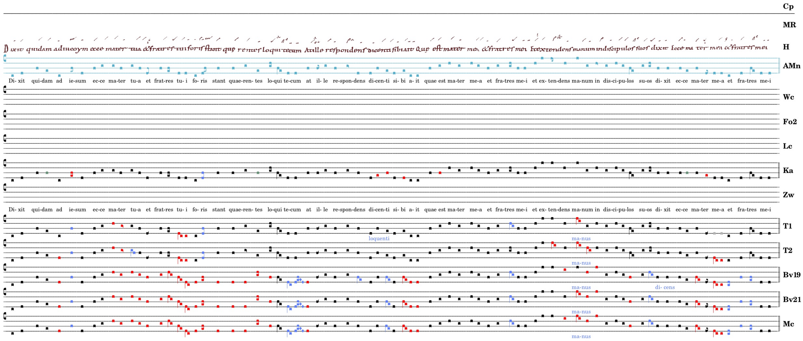 Dixit quidam ad iesum / ecce mater tua / et fratres tui / foris stant / quaerentes loqui tecum / At ille respondens / dicenti sibi ait / Quae est mater mea et fratres mei / Et extendens manum in discipulos suos dixit / Ecce mater mea / et fratres meis.
