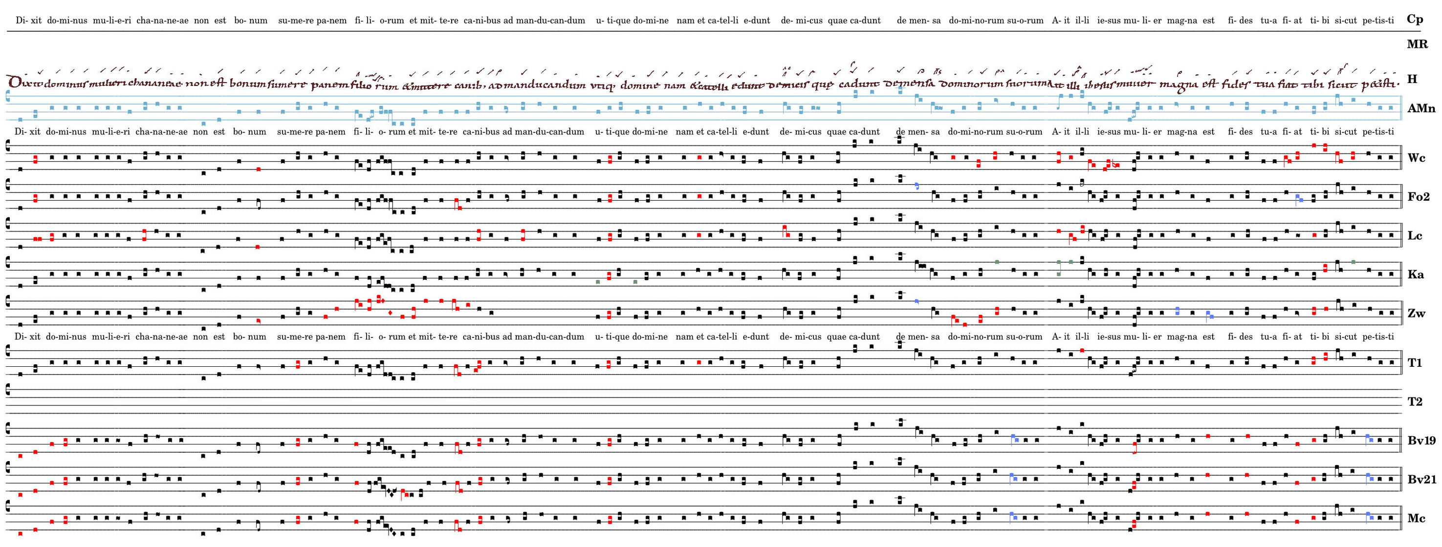 Dixit dominus / mulieri chananeae / non est bonum sumere panem / filiorum / et mittere canibus ad manducandum / utique domine nam et catelli edunt de micis / quae cadunt de mensa / dominorum suorum / Ait illi iesus mulier / magna est fides tua / fiat tibi sicut petisti.