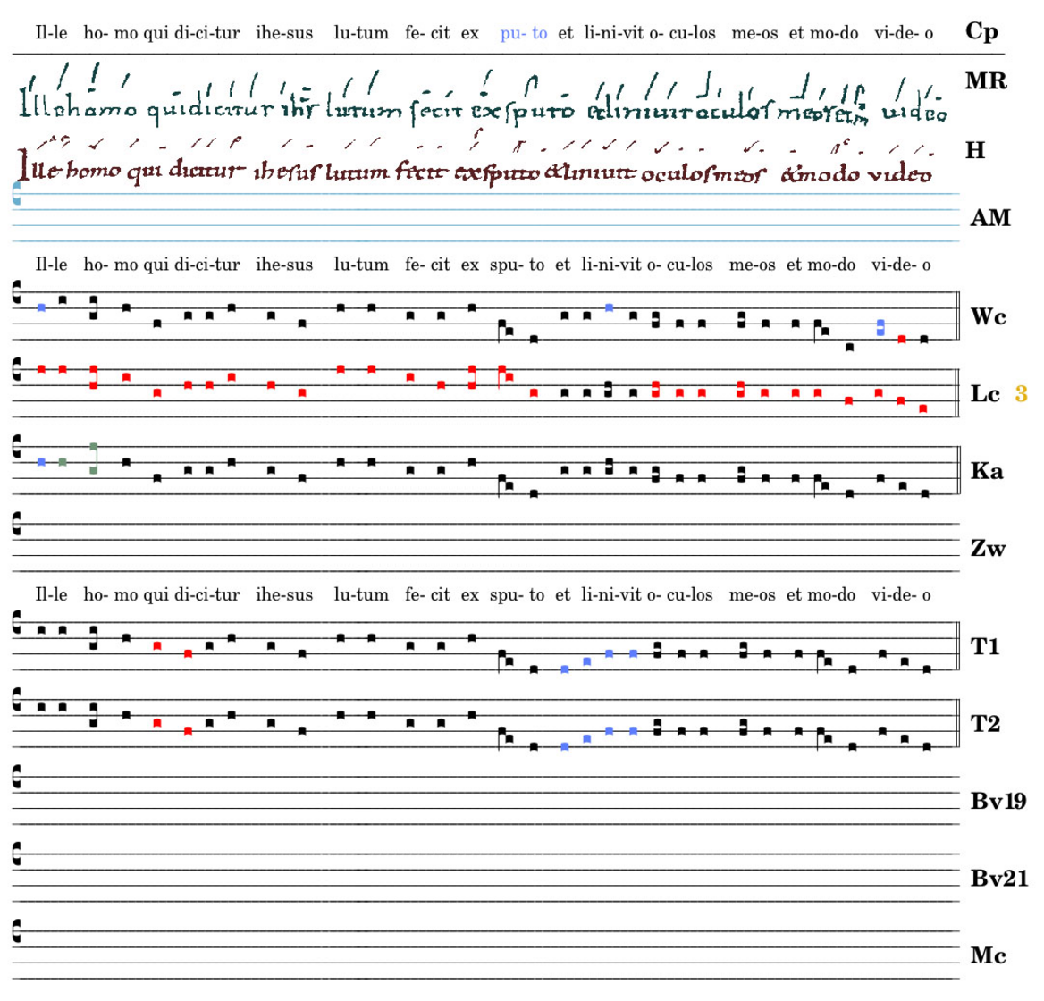 Die Quellenlage dazu ist aufschlussreich: die traditio frOc (MR + Wc) beschönigt die Situation indem sie den ersten Ton zum „la“ senkt. Lc wandert in den DT aus, in Ka schlägt die do-Revision voll zu. Nur Tol entspricht den Neumen von H.