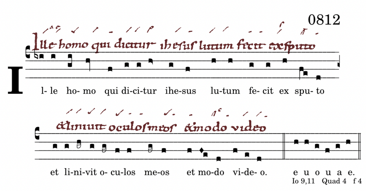Verblüffend der Anfang der Antiphon mit 1MED typ mit „sa“, rhetorisch richtig: Die Antiphon setzt einen bereits laufenden Dialog zwischen den Nachbarn und dem Blindgeborenen fort. Der TerzPes ist gegenüber dem Normalfall einen Ton höher transponiert.