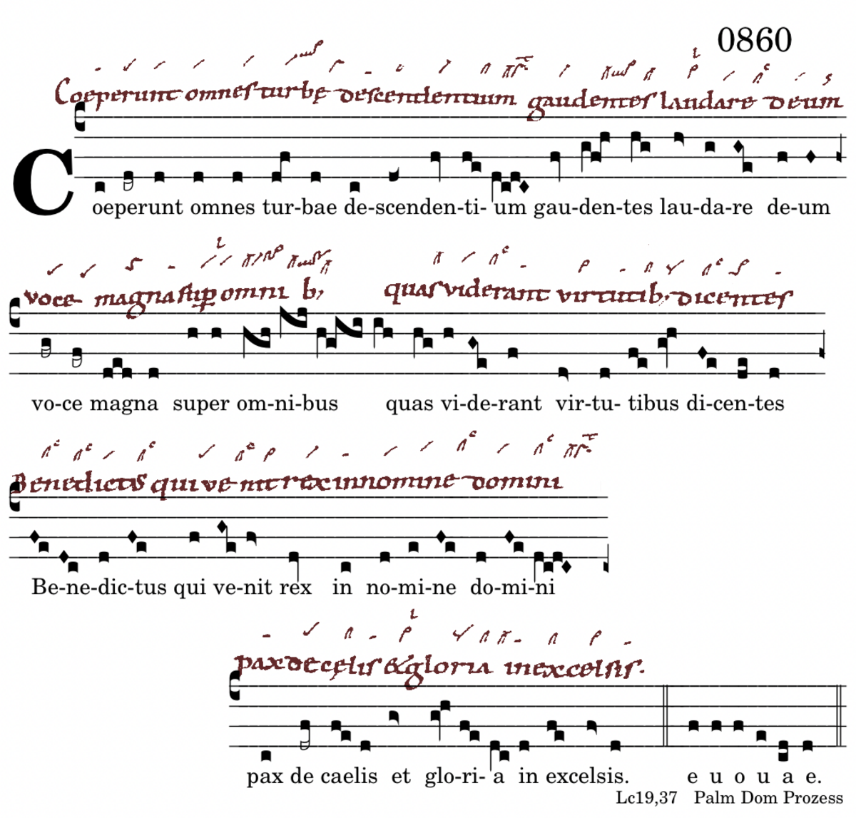 Coeperunt omnes turbae descendentium / gaudentes laudare deum voce magna / super omnibus quas viderant virtutibus dicentes / Benedictus qui venit rex in nomine domini / pax de caelis et gloria in excelsis.