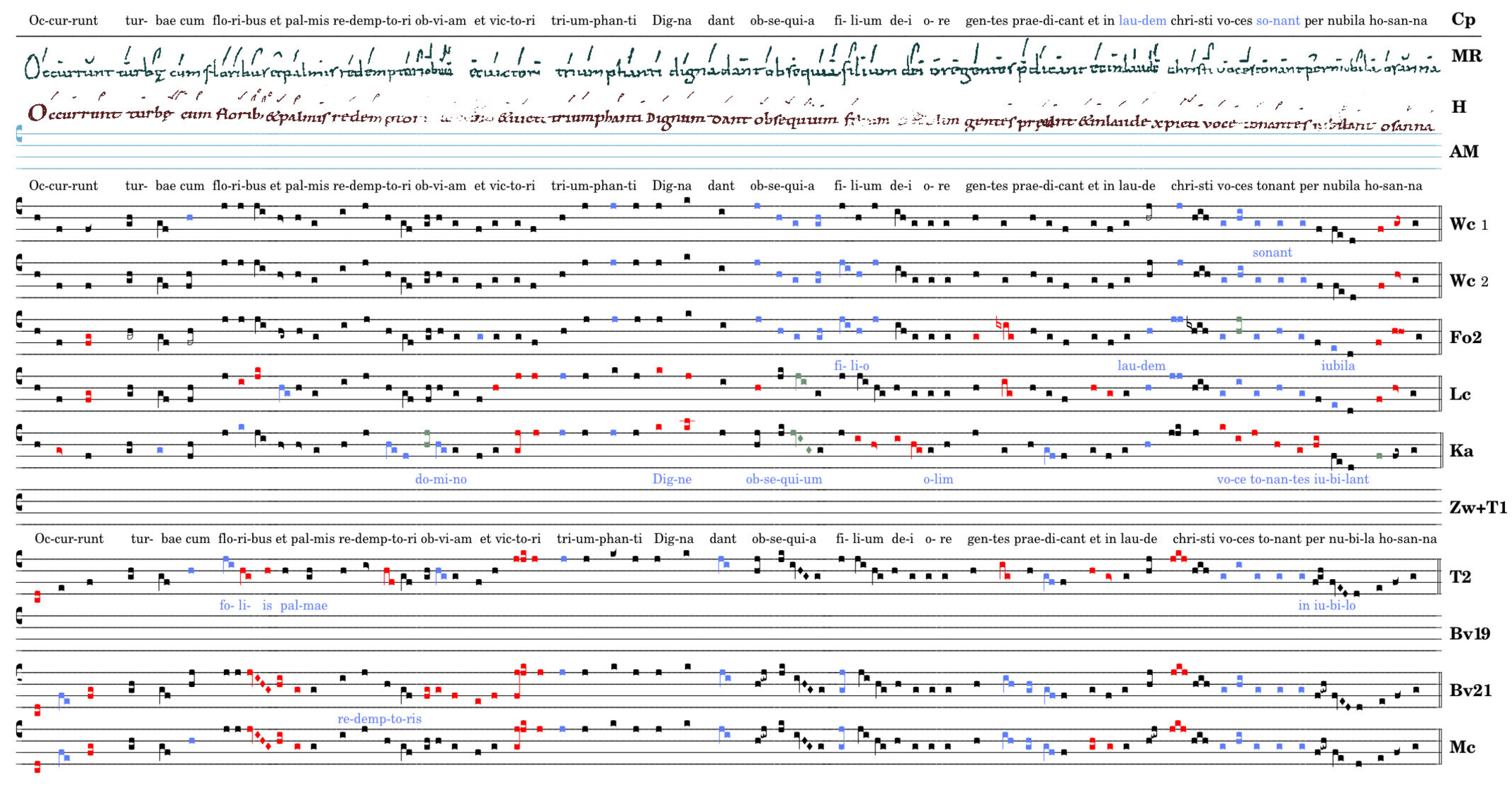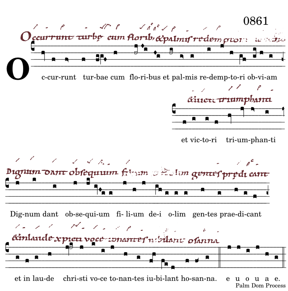 Occurrunt turbae cum floribus et palmis redemptori obviam et victori triumphanti dignum dant obsequium filium dei ore gentes praedicant et in laude christi / voce sonantes / iubilant osanna.