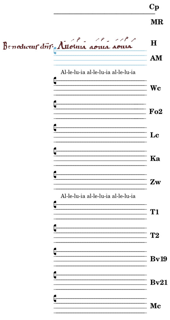 Da das zweite „alleluia“ eine Silbe zuviel hat, bleibt die Melodie auf „fa“ die Clivis wird zum Cephalicus reduziert.