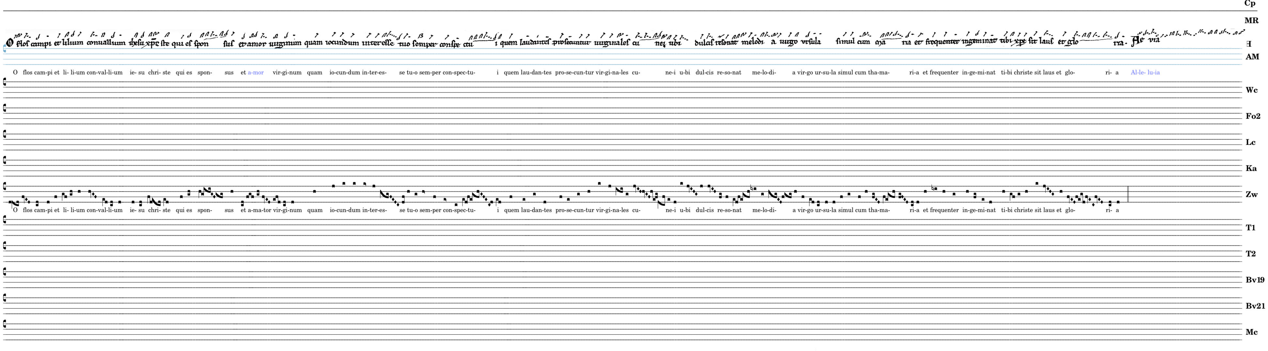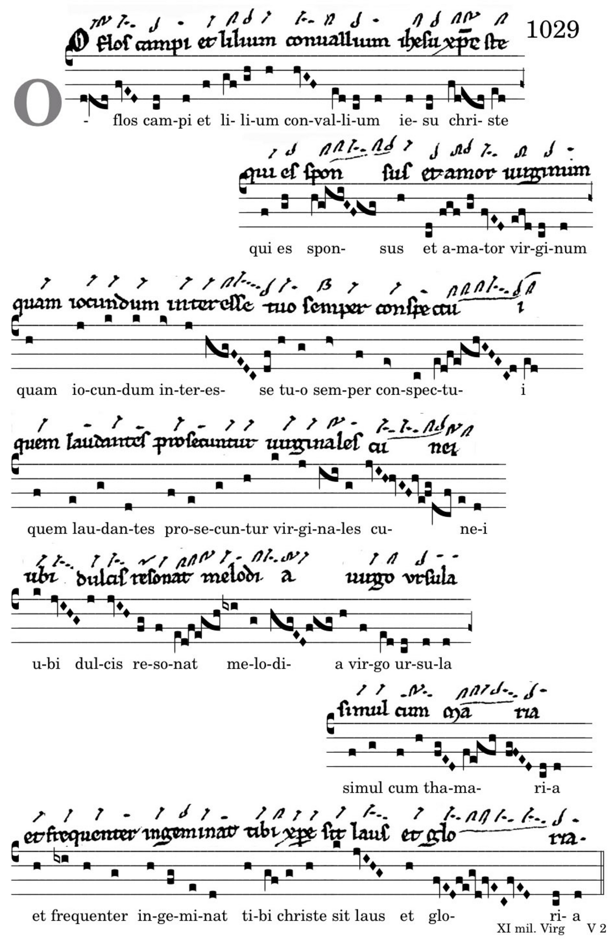 O flos campi et lilium convallium / iesu christe qui es sponsus et amor virginum / quam iucundum interesse tuo / semper conspectui / quem laudantes prosequuntur / virginales cunei / ubi dulcis resonat melodia / virgo ursula simul cum maria / et frequenter ingeminat / tibi christe sit laus et gloria.