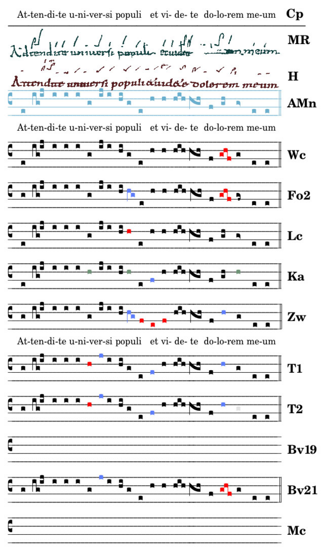 Die Clivis suprapunctis auf der Silbe „At-ten-dite“ wird bei der Wiederholung des Centos auf die drei Silben „u-ni-ver-si“ aufgeteilt.