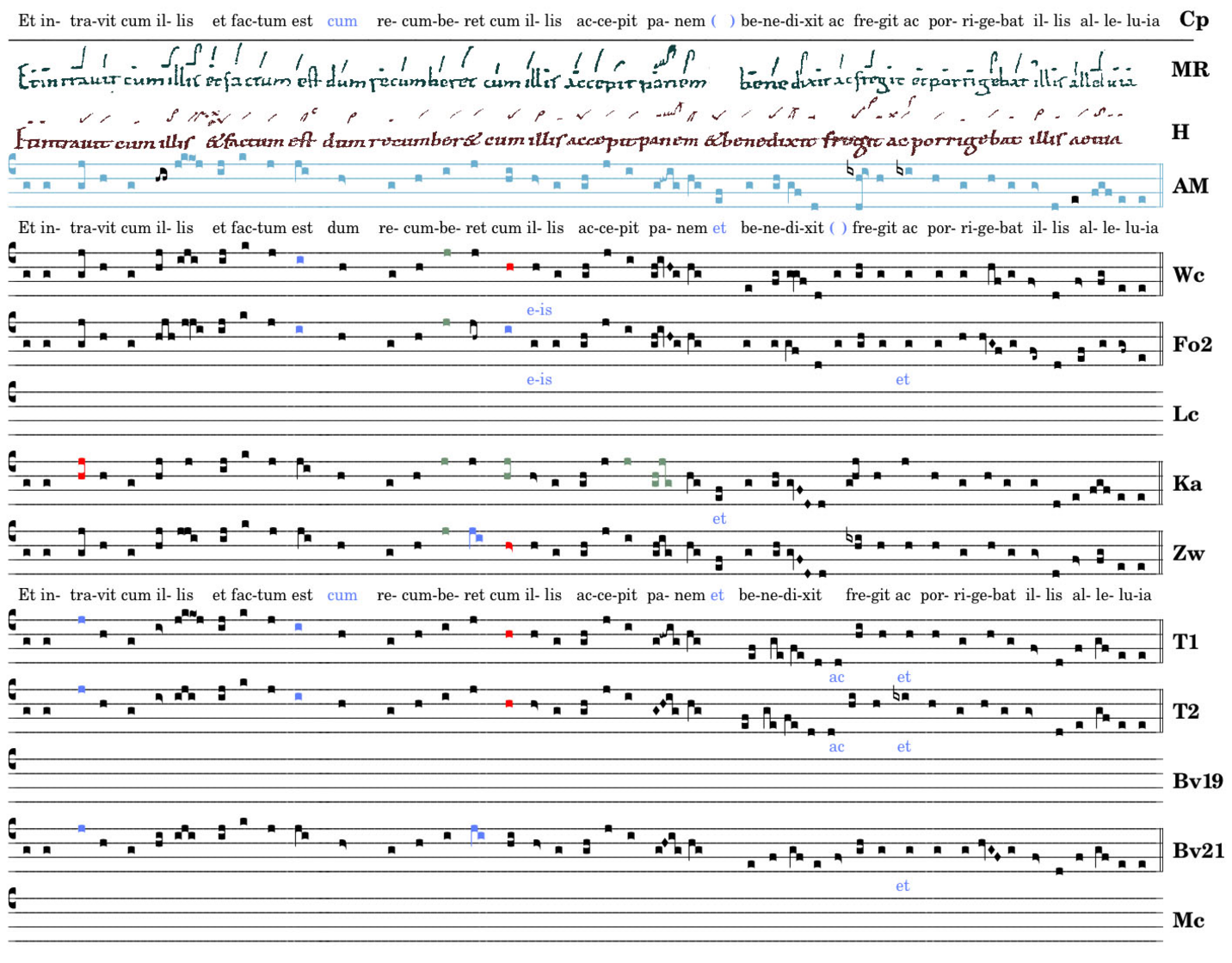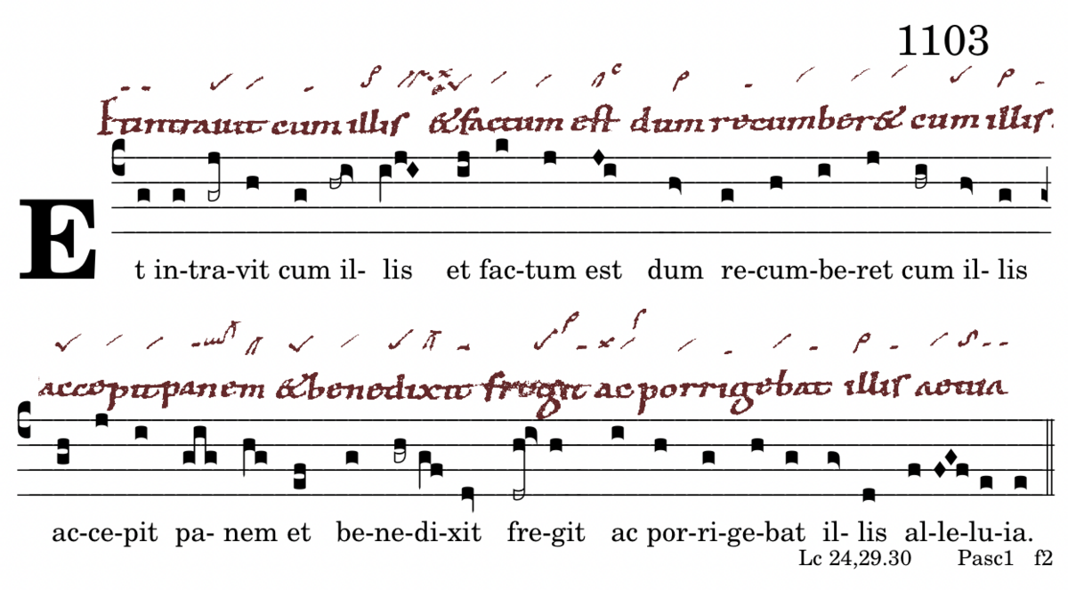 Et intravit cum illis / et factum est / dum recumberet cum illis / accepit panem / benedixit fregit / ac porrigebat illis / alleluia.