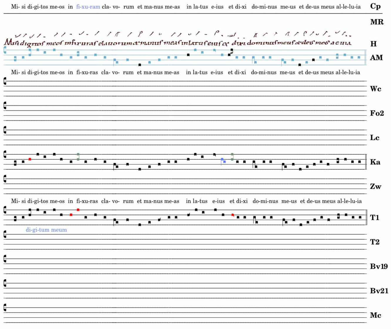 Misi / digitos meos / in fixuras clavorum / et manus meas / in latus eius et dixi / dominus meus / et deus meus / alleluia.