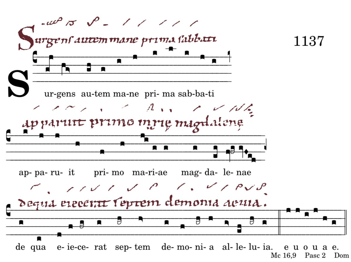 Surgens autem / mane prima sabbati / apparuit / primo mariae / magdalenae / de qua eiecerat / septem daemonia / alleluia.
