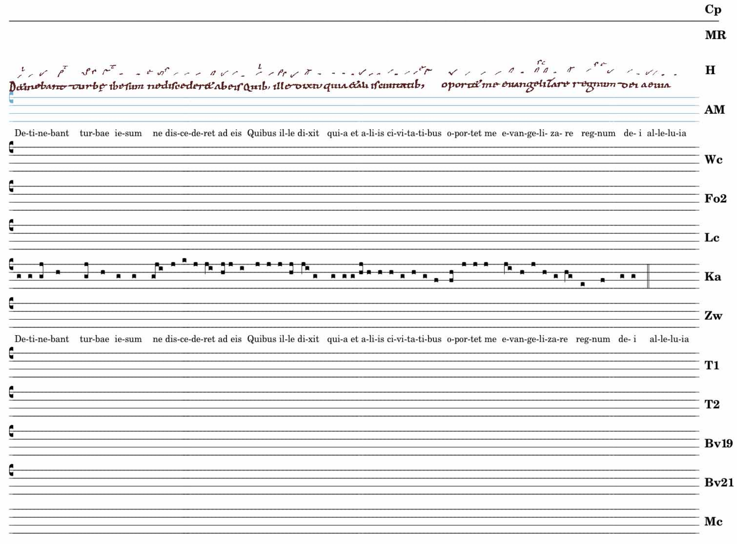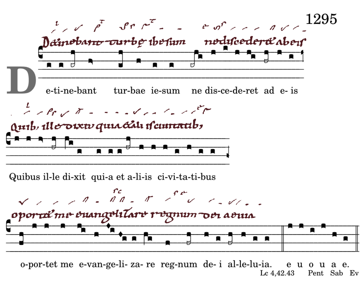 Detinebant turbae iesum / ne discederet ad eis / quibus ille dixit / quia et aliis civitatibus / oportet me / evangelizare / regnum dei alleluia.